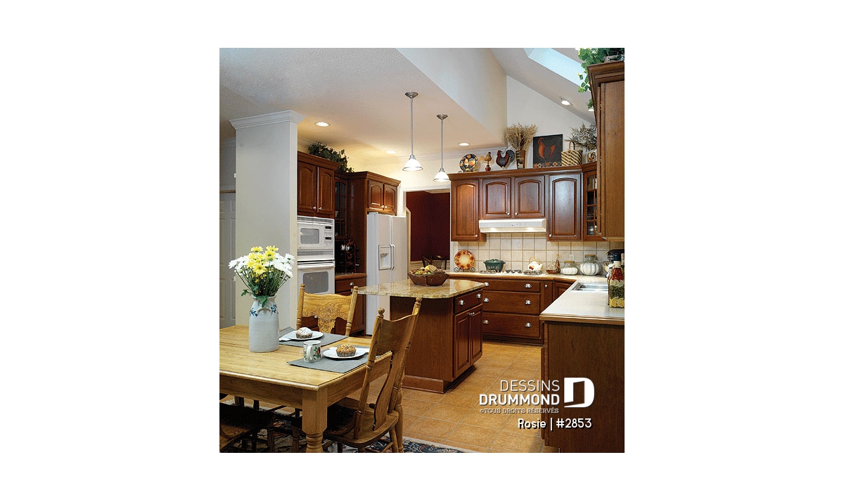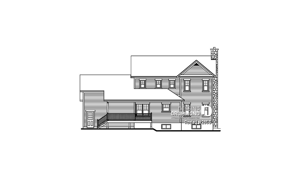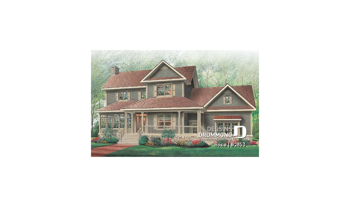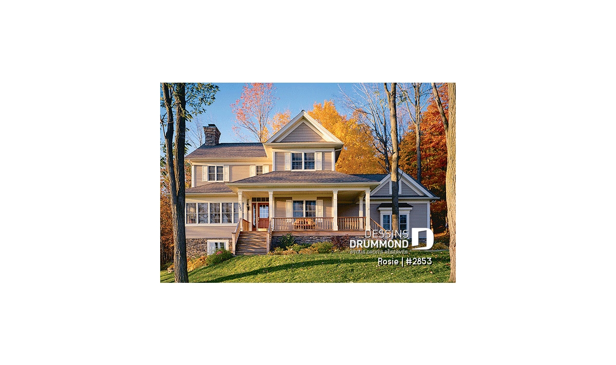 > En tant que l’un des plans de Dessins Drummond qui plaisent le plus des deux côtés de la frontière Canado-américaine, ce modèle se veut tout d’abord élégant avec sa grande galerie en façade, ses toitures simplifiées et ses ouvertures bien balancées et discret de la façon dont il dissimule si bien son garage double.