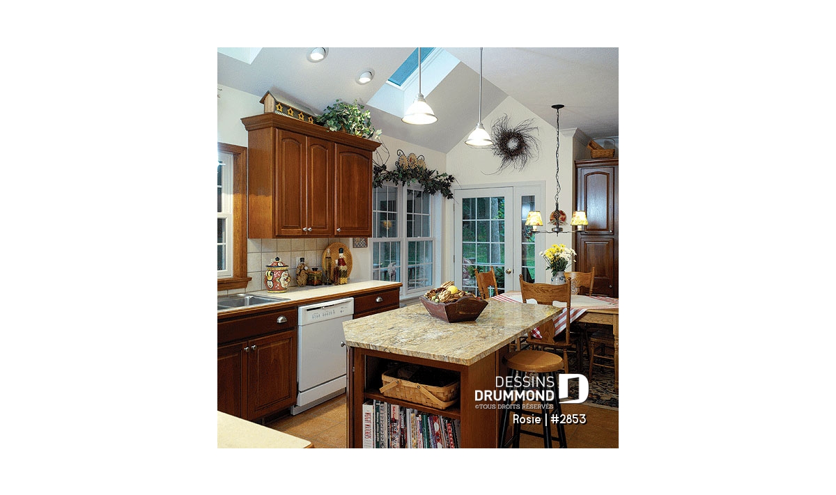 Cuisine avec îlot central, bel espace dînette et coin ordinateur.