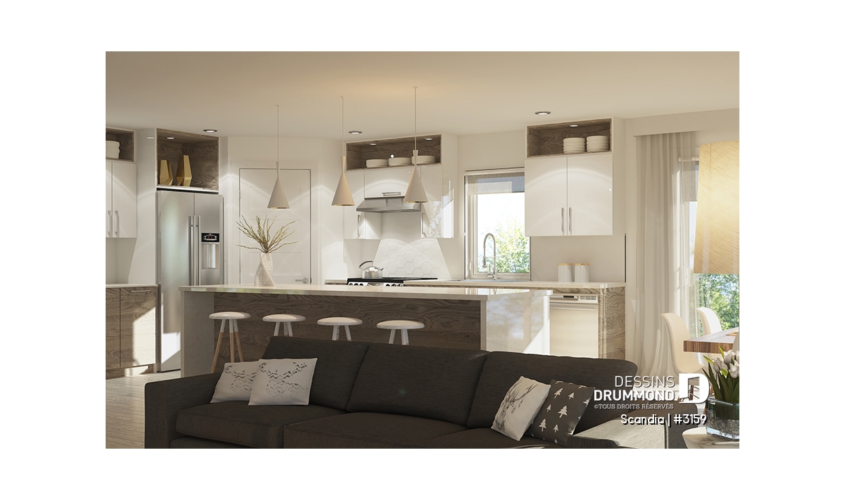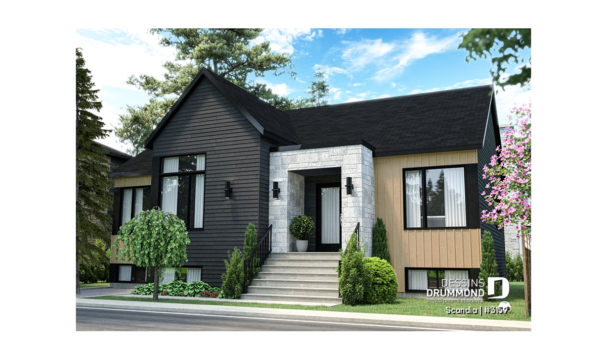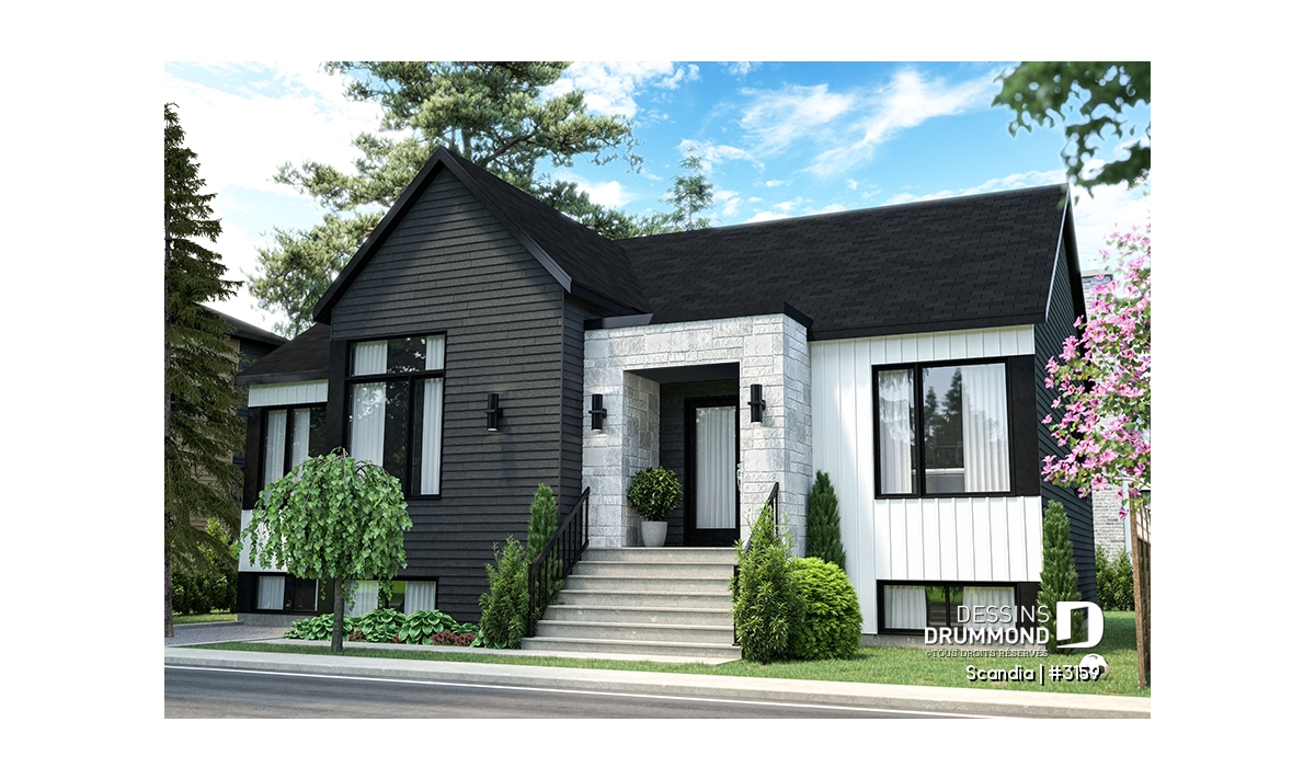 Scandi (plan #3159) est superbe plan de maison moderne d'inspiration Scandinave de 1400 pieds carrés au rez-de-chaussée.