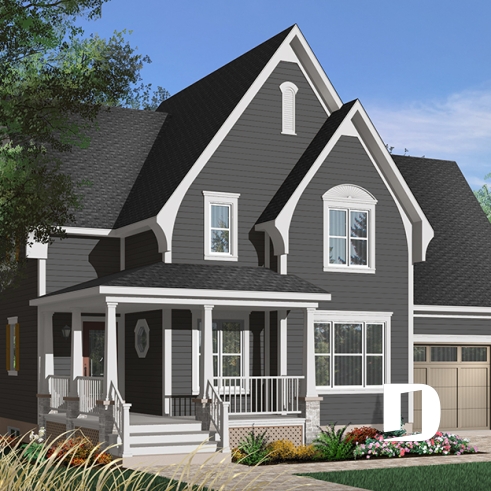 Plan de maison Tudor 3 chambres, garage, espace remarquablement ouvert, buanderie, îlot
