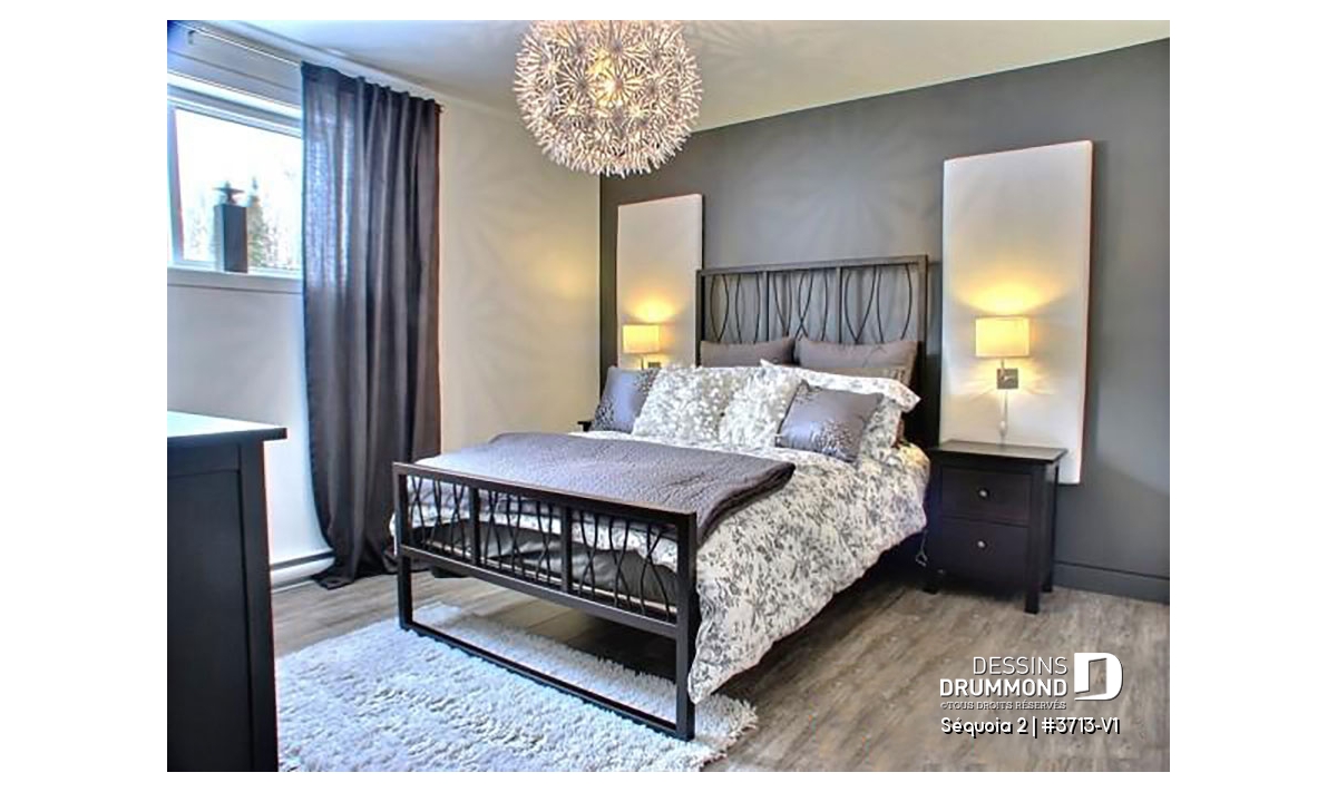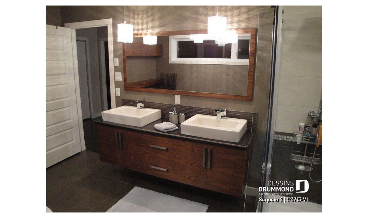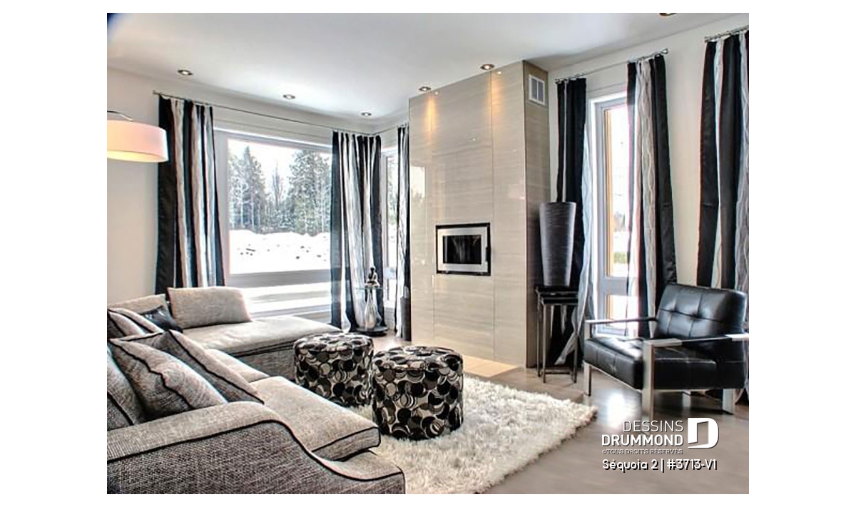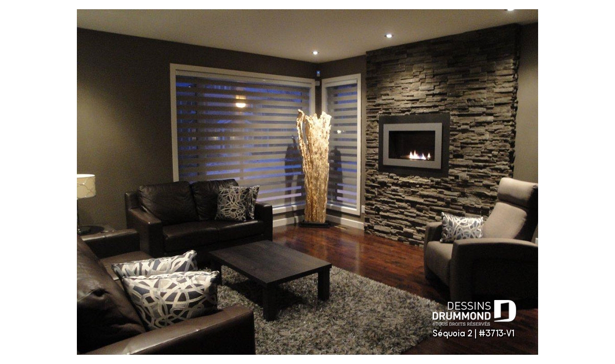 À l’intérieur, mis à part cette entrée de service en provenance du garage, ce plan reçoit les mêmes attributs que le plan 3713 dont il origine soit : un plafond à 9’ sur tout le rez-de-chaussée, un foyer contemporain à la salle de séjour, une cuisine avec îlot-lunch de 8pi x 3pi. et coin séjour attenant, des chambres de bon format avec garde-robes adéquates dont un walk-in à la chambre des maîtres et finalement, une salle de bain attrayante avec douche indépendante de 42po x 60po.
