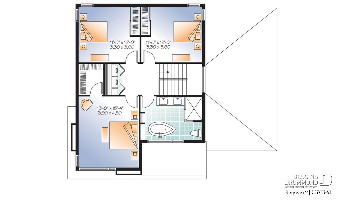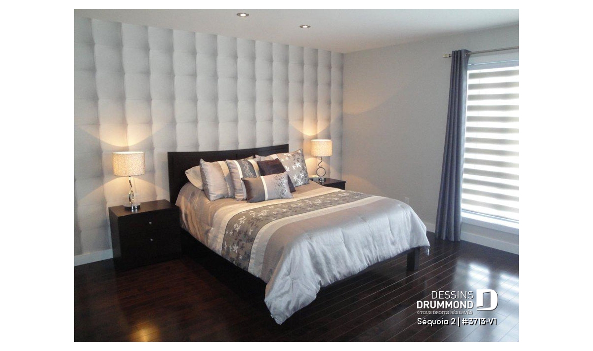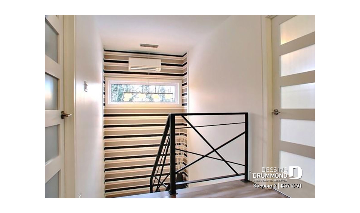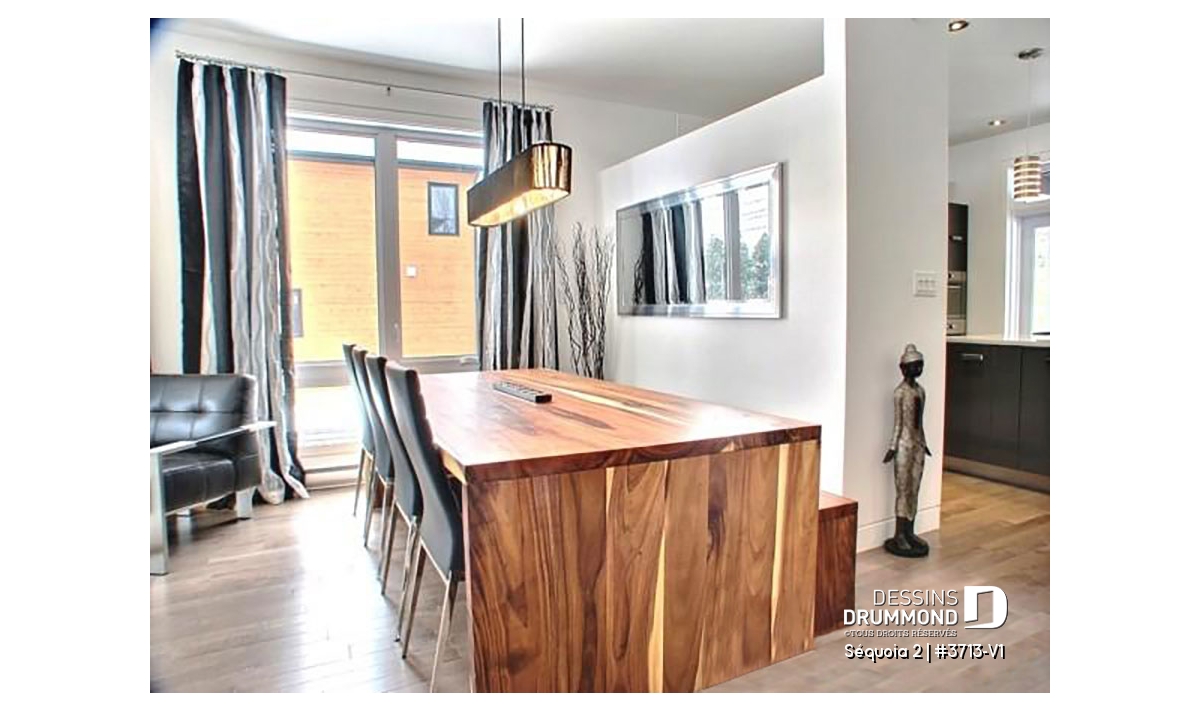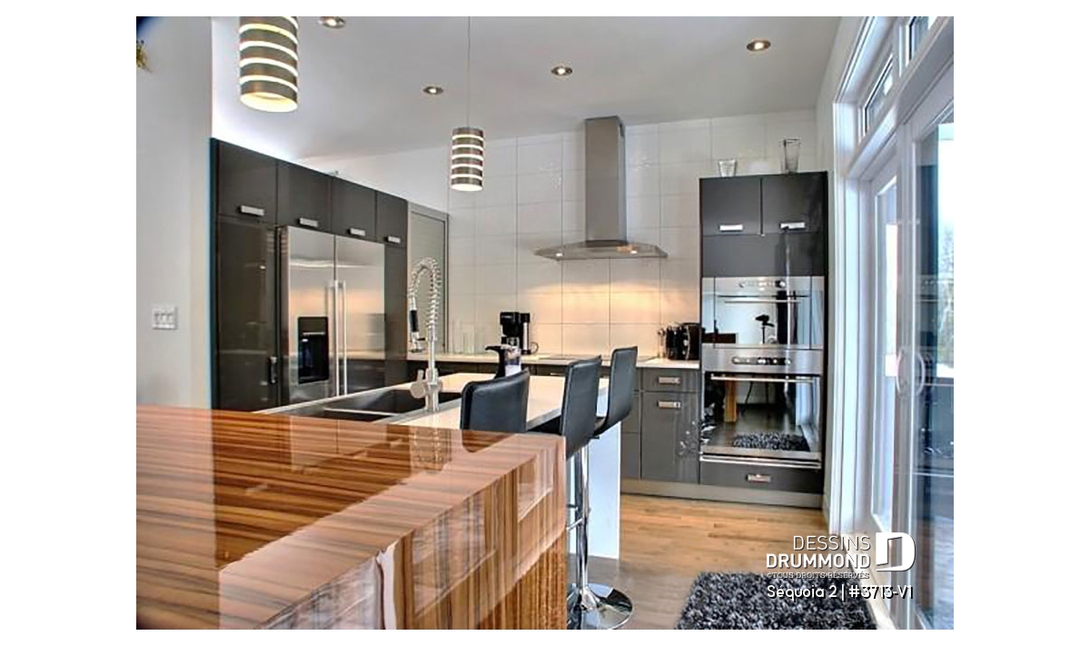 À l’intérieur, mis à part cette entrée de service en provenance du garage, ce plan reçoit les mêmes attributs que le plan 3713 dont il origine soit : un plafond à 9’ sur tout le rez-de-chaussée, un foyer contemporain à la salle de séjour, une cuisine avec îlot-lunch de 8pi x 3pi. et coin séjour attenant, des chambres de bon format avec garde-robes adéquates dont un walk-in à la chambre des maîtres et finalement, une salle de bain attrayante avec douche indépendante de 42po x 60po.