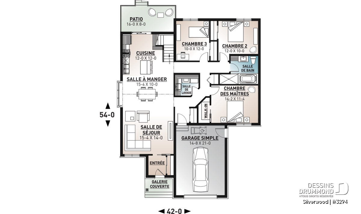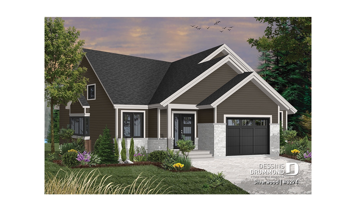 Ce nouveau plan de maison de plain-pied 3 chambres avec garage, plan no. 3294 de Dessins Drummond, aussi nommé Silverwood, propose un aménagement pratique de toutes les chambres et airs communs sur un seul et même plancher. Cette formule plait généralement aux familles avec jeunes enfants, permettant ainsi aux parents d’être à proximité de leurs jeunes.