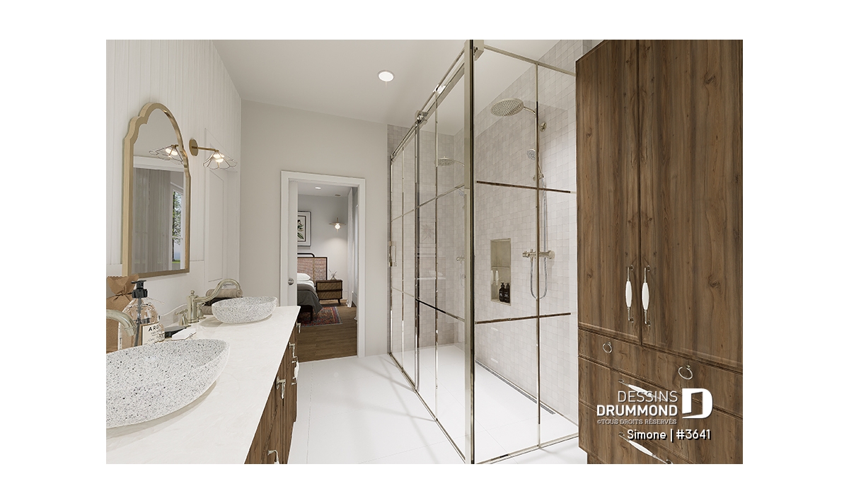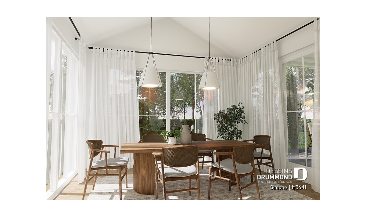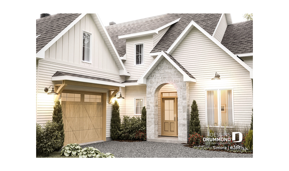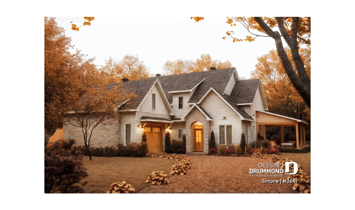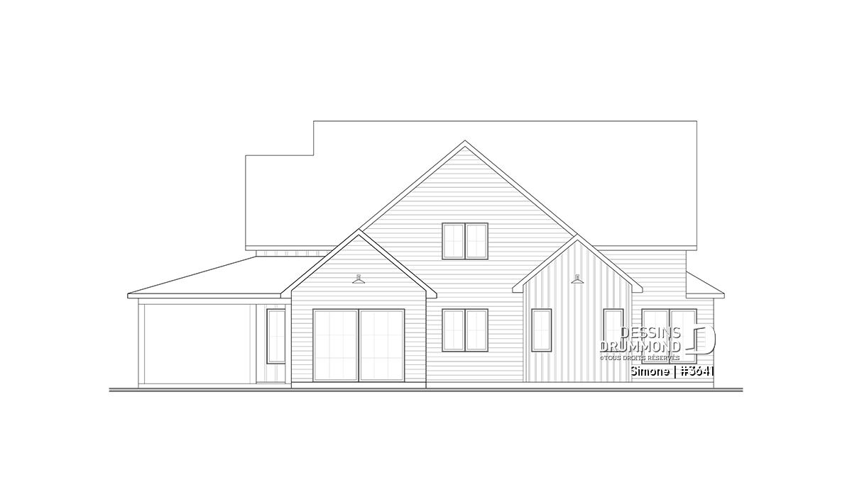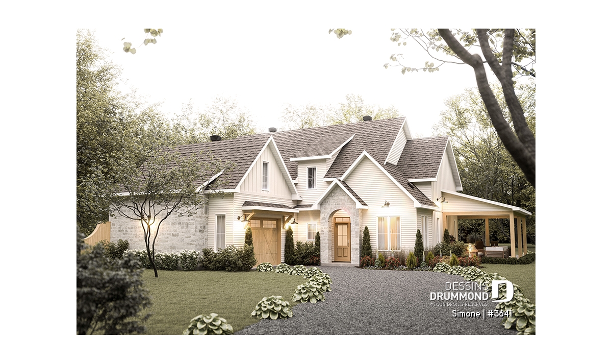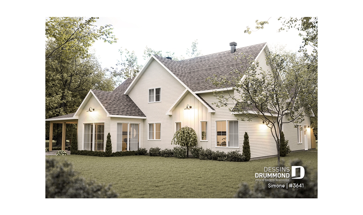 Le plan de maison SIMONE (#3641) offre un grand 2528 pi.ca. d'espace, aménagé sur 2 planchers. La fondation initiale prévue est une dalle flottante. Il est à noter que tous nos plans offrent plusieurs types de fondation.