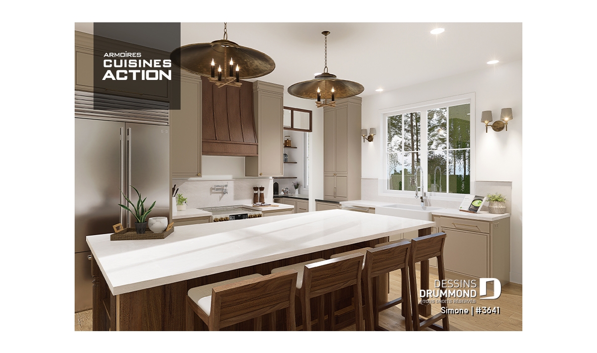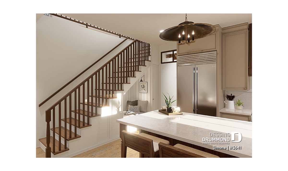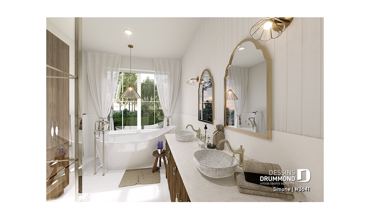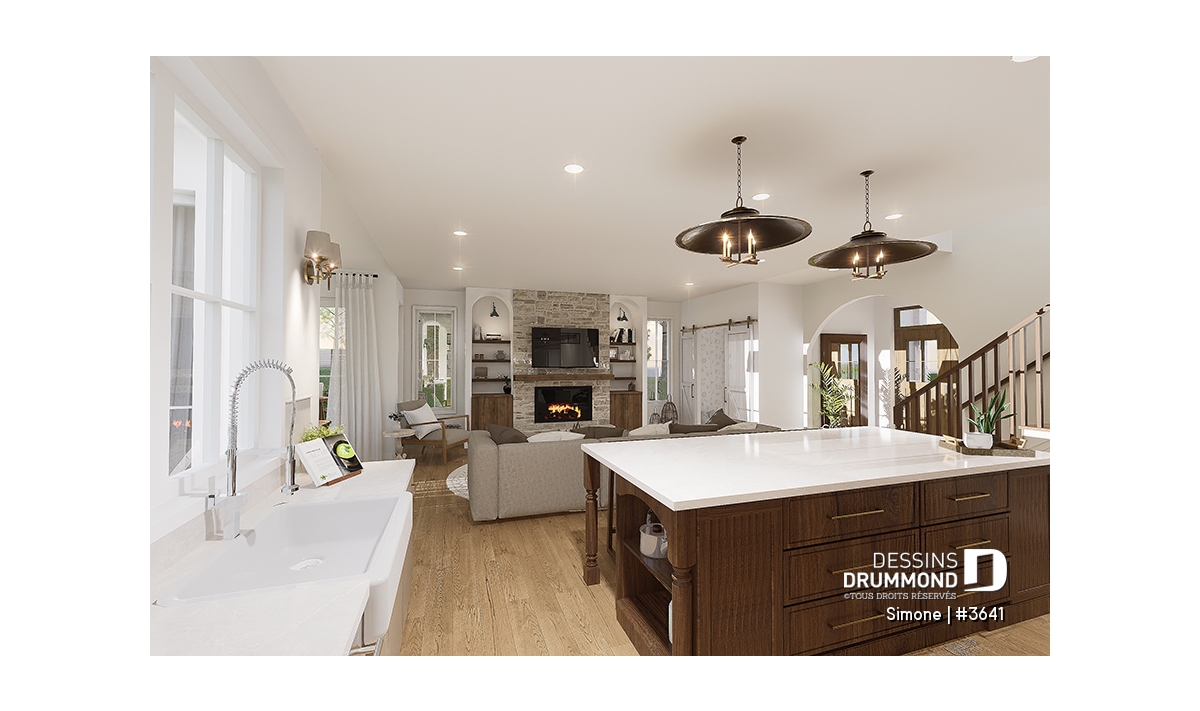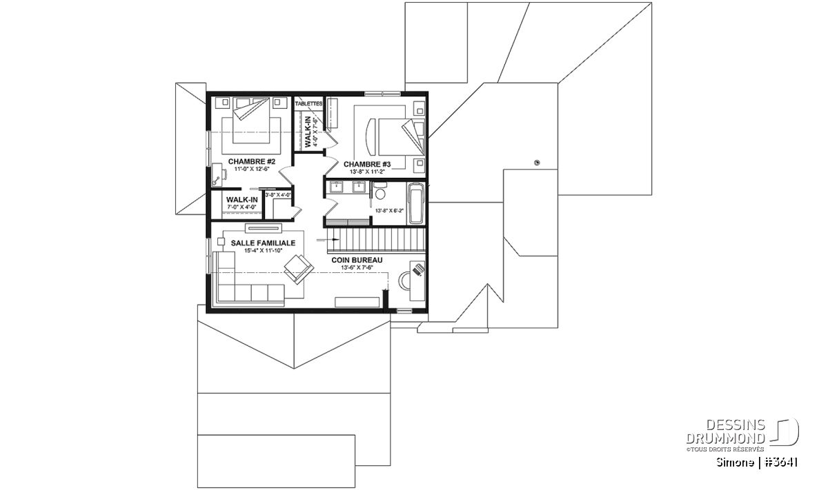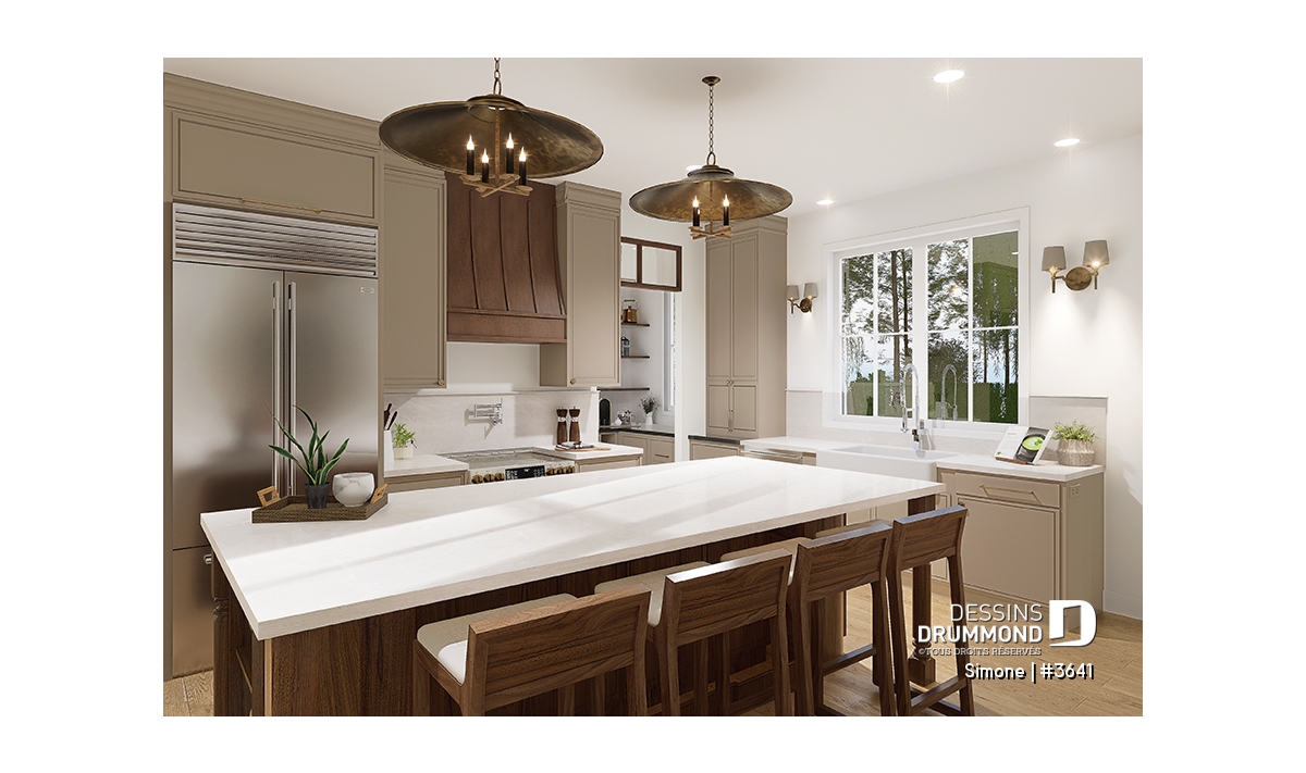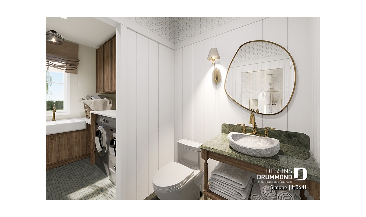 Le plan de maison SIMONE (#3641) offre un grand 2528 pi.ca. d'espace, aménagé sur 2 planchers. La fondation initiale prévue est une dalle flottante. Il est à noter que tous nos plans offrent plusieurs types de fondation.
