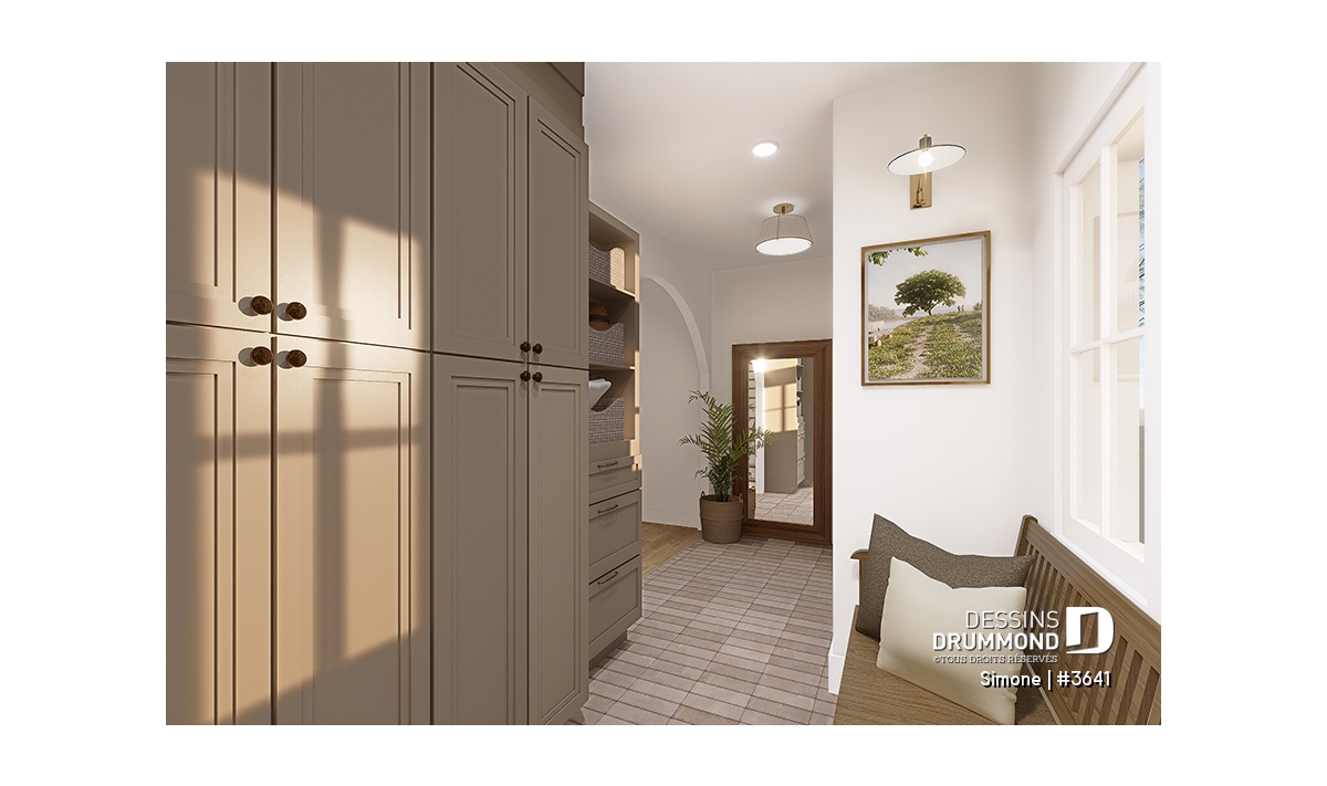 Le vestiaire est accessible de l'entrée avant principale, ainsi que du garage. Il propose une banquette et un mur avec crochets.