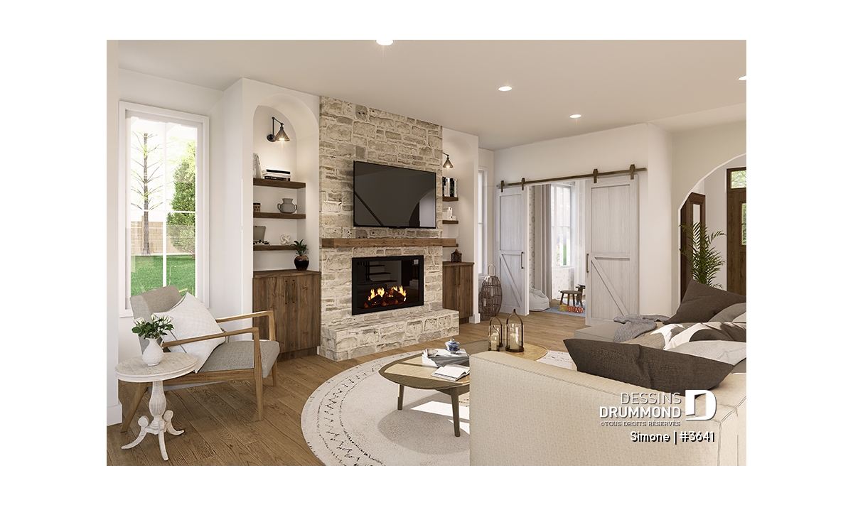 Plusieurs arches décoratives sont proposées aux espaces transitoires ainsi qu'au mobilier encastré, de chaque côté du foyer.