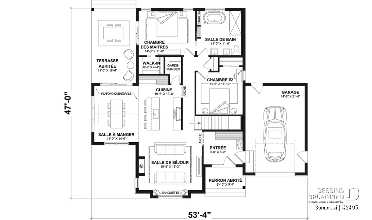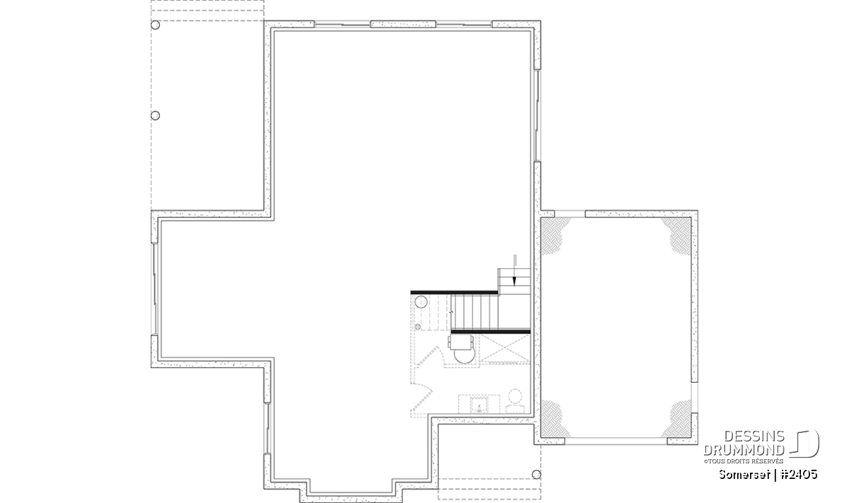Le plan de maison SOMERSET (#2405) propose 1352 pi.ca. au rez-de-chaussée et la même chose au sous-sol qui est non-aménagé, à l'exception de la salle de lavage qui s'y trouve. Un garage de 365 pi.ca. est annexé à la maison et a un accès direct au vestibule, ce qui est pratique quand vous arriverez à la maison avec vos emplettes.