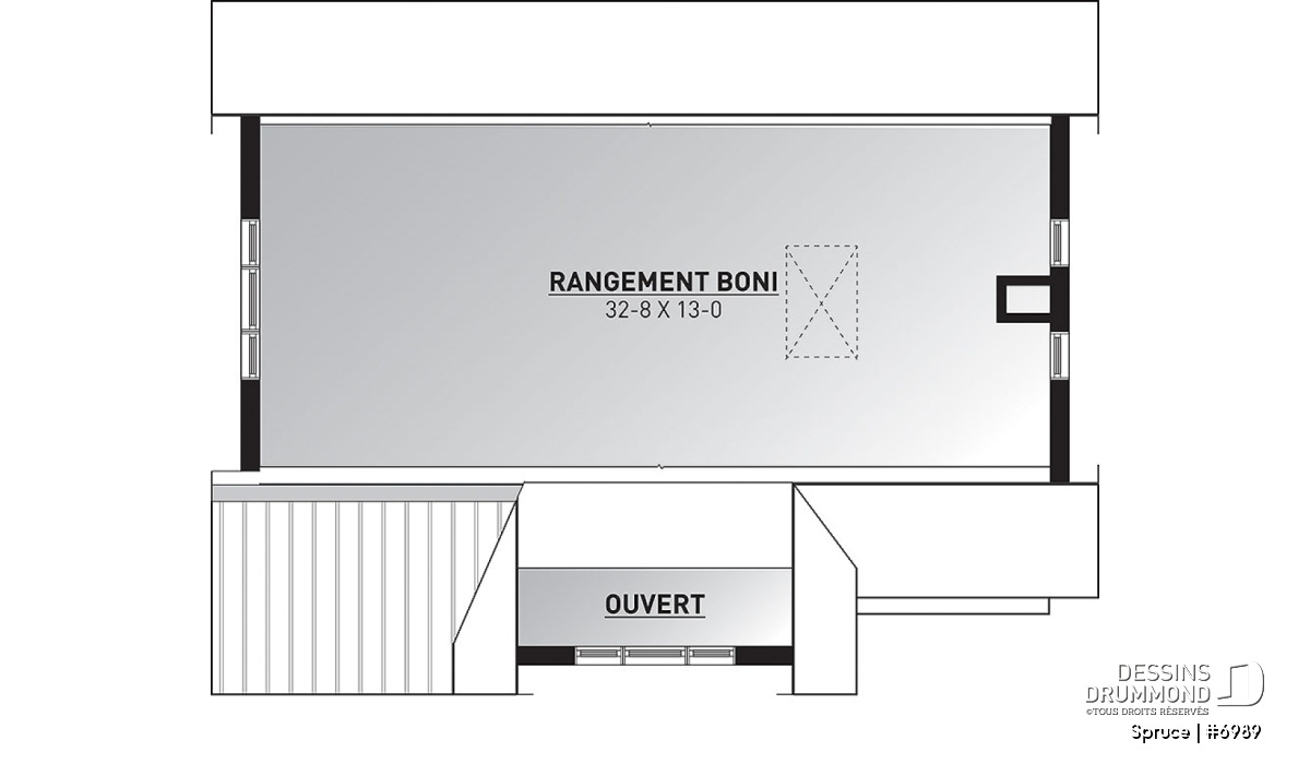 Souvent localisé au-dessus du garage, le rangement boni est utilisé uniquement comme rangement et il est généralement accessible du garage via un escalier escamotable. De plus, la finition de ce rangement boni est toujours INCLUSE dans nos estimation du coût de construction, sauf si avis contraire dans les sections « Description et/ou Éléments descriptifs » de la page du plan.