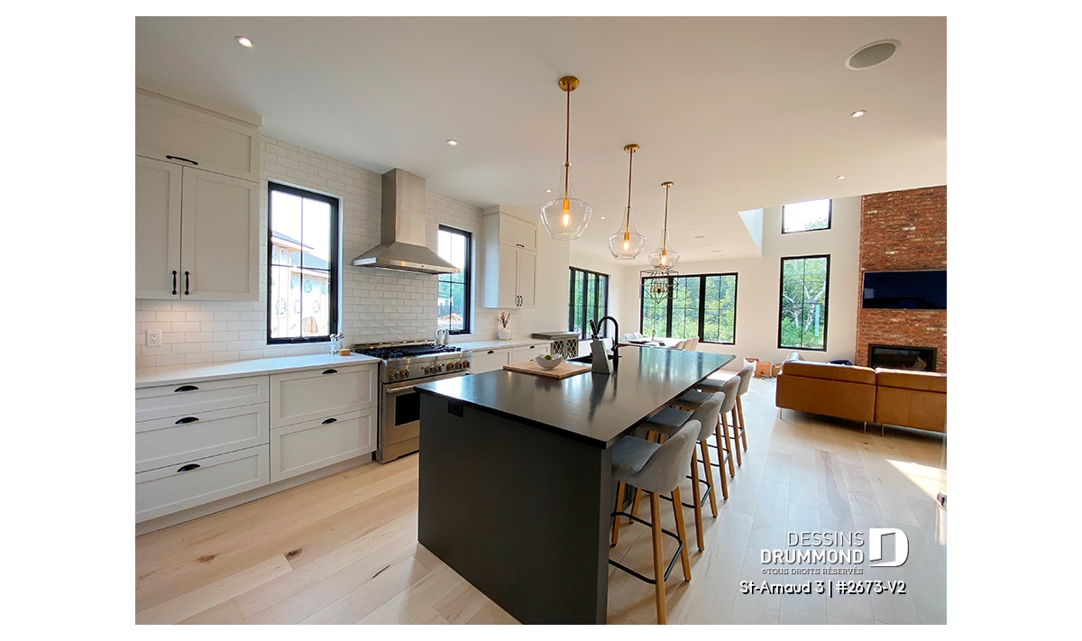 Le salon et la salle familiale se distinguent par leur foyer central sur deux étages, qui apporte une touche de charme authentique et une ambiance conviviale. Le modèle de foyer à bois proposé est le STÛV s21, reconnu pour son design élégant et sa performance. La mezzanine ouverte et le plafond cathédral donnent un effet spectaculaire et baignent l’espace de lumière naturelle, créant ainsi un lieu de détente unique où toute la famille aime se rassembler.