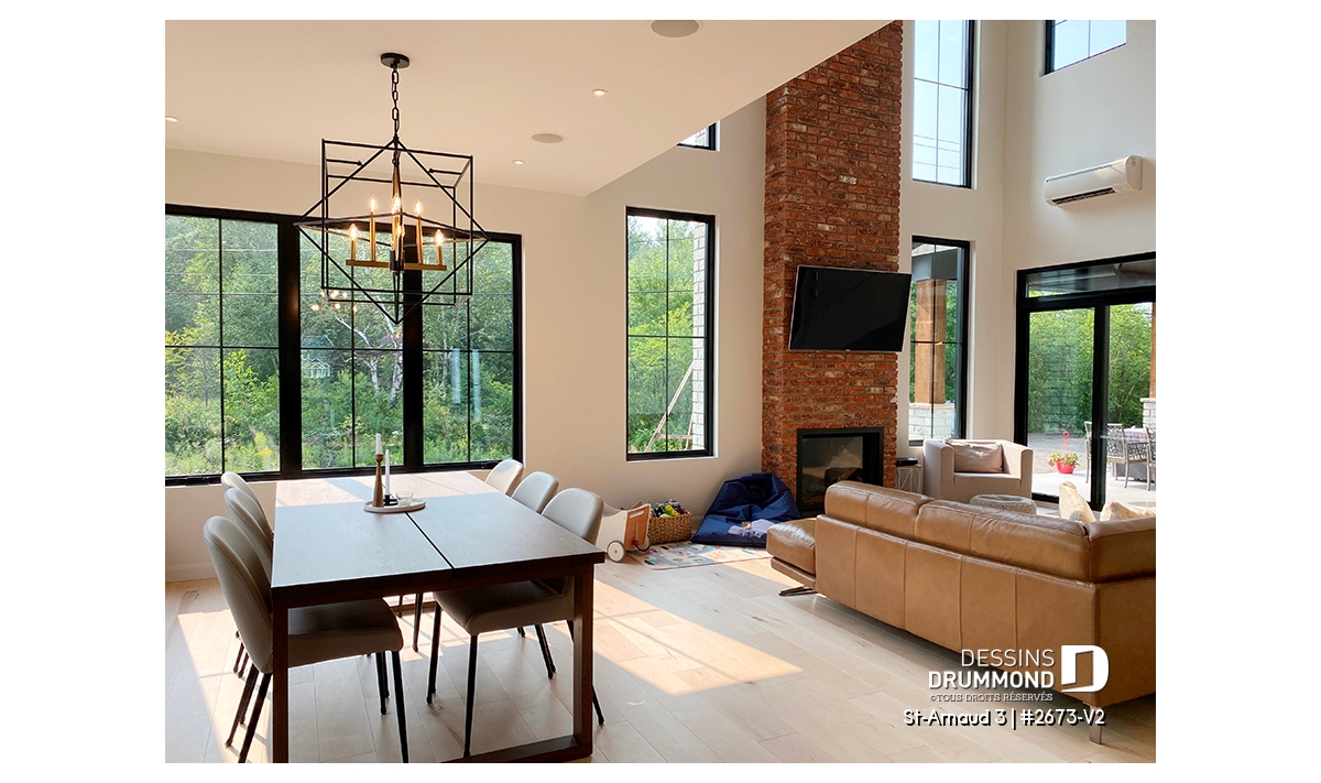 Salle à manger attenante à la salle familiale avec *foyer central sur 2 étages pour une ambiance chaleureuse.