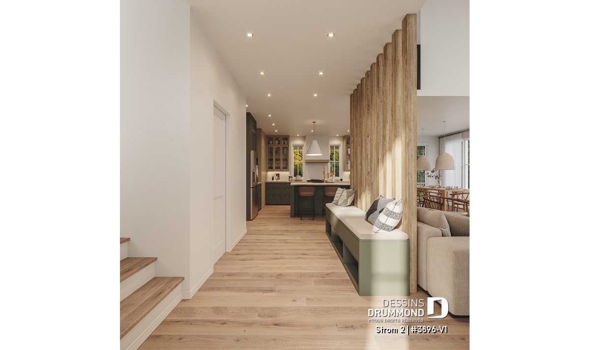 L’entrée avant spacieuse accueille vos invités avec élégance et propose une garde-robe walk-in, parfaite pour organiser manteaux et chaussures. Une banquette conviviale, adossée à un mur de lattes laissant passer la lumière, ajoute une touche à la fois pratique et décorative.