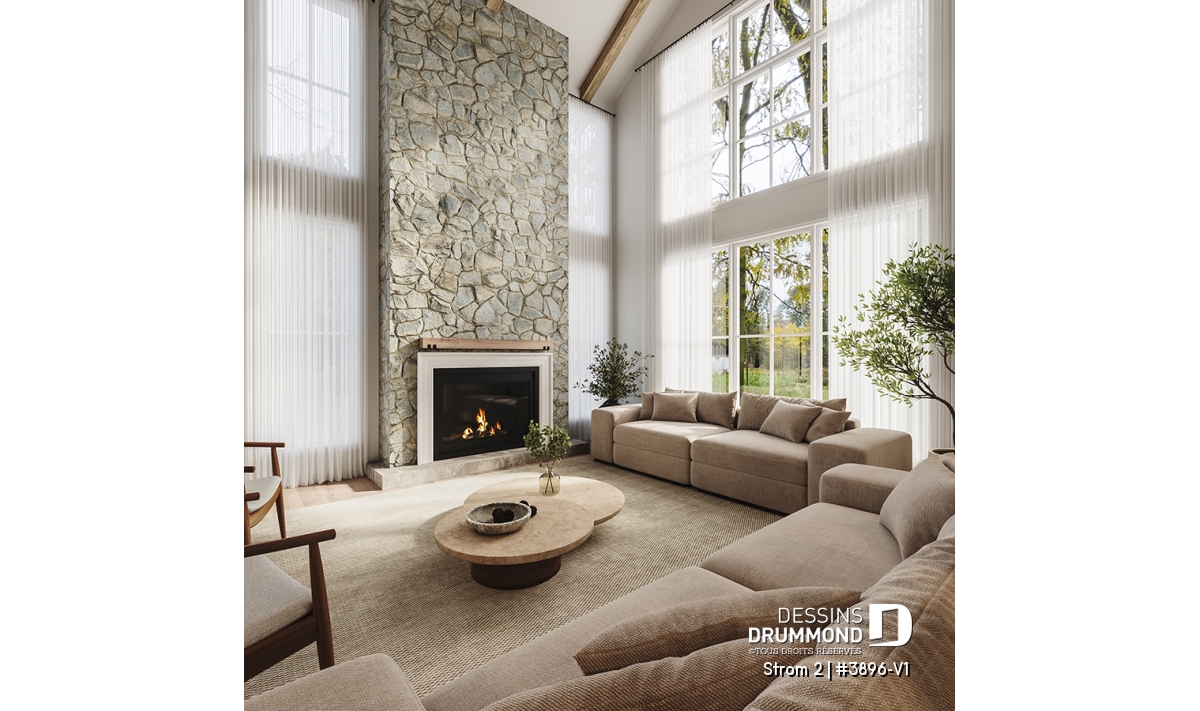 Salon lumineux avec plafond cathédrale et foyer chaleureux.