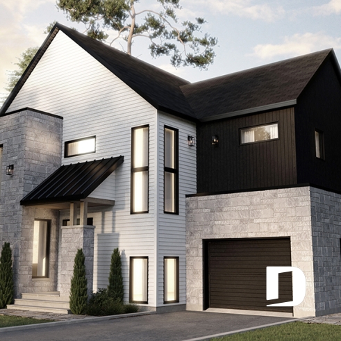 À l’extérieur, le design mélange plusieurs textures comme de la maçonnerie sur le mur de l’immense fenêtre du salon. On en retrouve également dans l’entrée du perron couvert, sous forme de muret, ainsi qu’alentour de la porte du garage. Du revêtement à l’horizontale et à la verticale donne aussi un effet moderne, sans oublier le style des fenêtres intéressant sur toute la façade.
