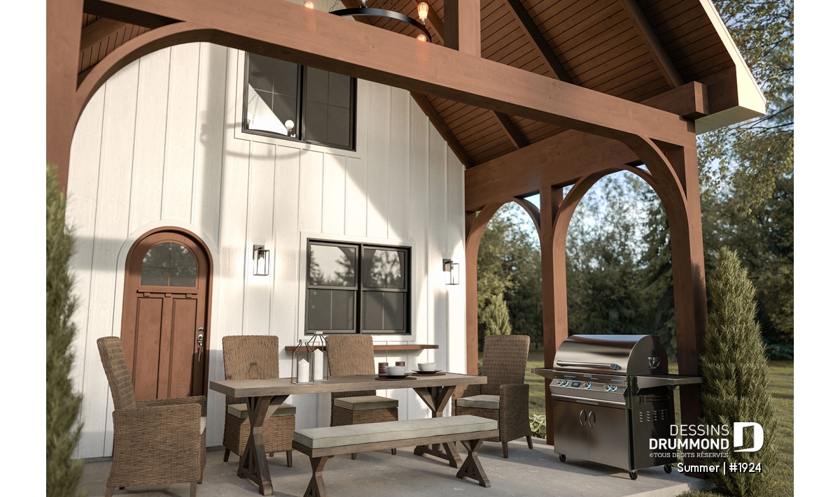 La grande terrasse abritée de 18' x 12' vous séduira par son style rustique en proposant des poutres de bois arquées ainsi qu'une porte avant de forme similaire. Une tablette a été stratégiquement ajoutée sous la fenêtre avant, vous permettant ainsi de circuler nourriture et breuvages efficacement.