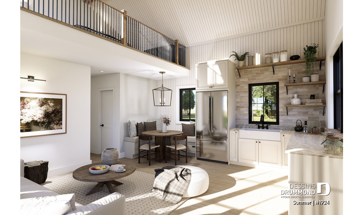 Aire ouverte, Arche, Tablettes, Banquette, Mezzanine, Plafond en pente, Terrasse abritée, Dinette / Coin déjeuner