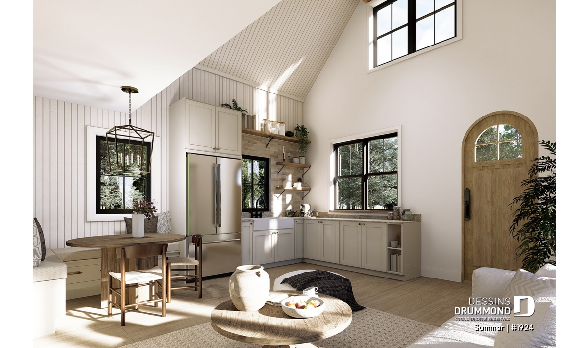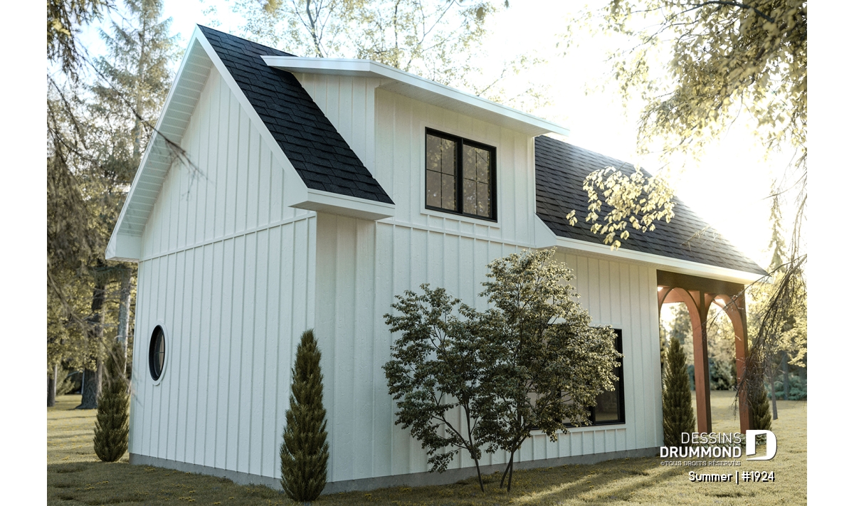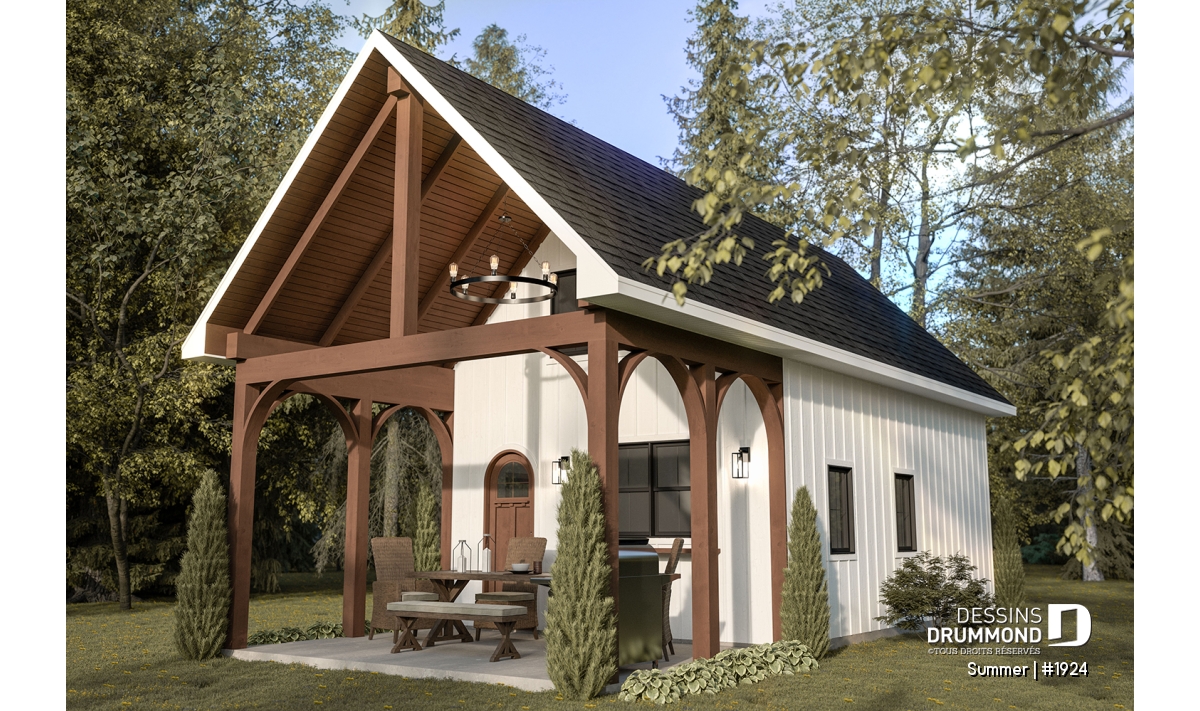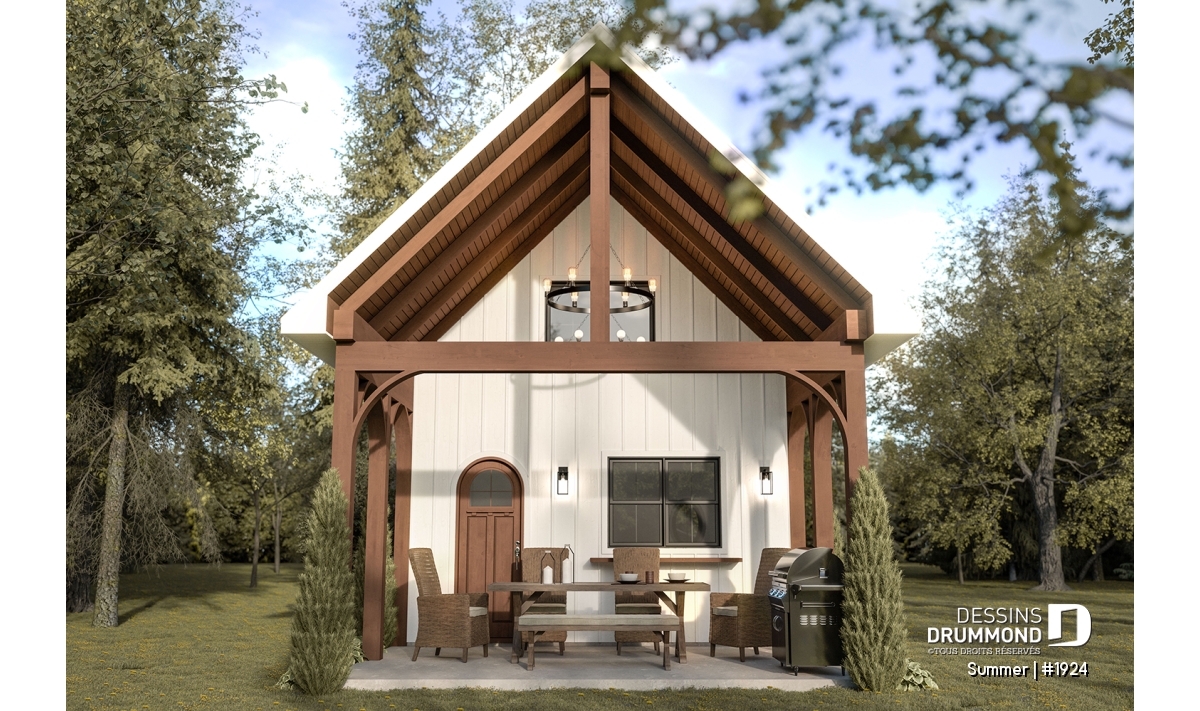 Le plan de mini-maison SUMMER (plan #1924) propose 636 pieds carrés aménagés sur 2 étages. La fondation prévue est une dalle monolithique, mais d'autres fondations sont disponibles, selon vos besoins. Son look vieille église rénovée lui confère un charme indéniable et chaleureux à la fois.