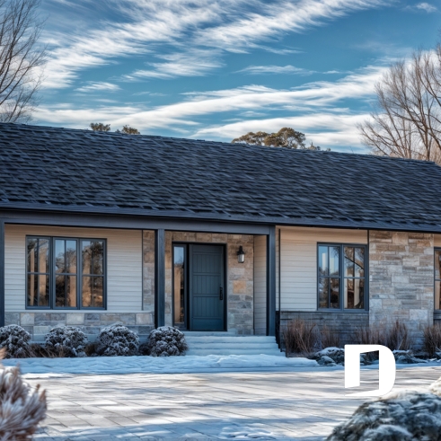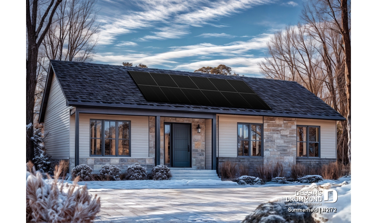 Ce plain-pied de style ranch séduit par son allure simple, chaleureuse et intemporelle. Sa façade élégante, rehaussée d’une touche de pierre naturelle et d’un choix de couleurs sobres, confère à cette maison un caractère à la fois rustique et raffiné. Son architecture compacte et bien proportionnée en fait un choix idéal pour les auto-constructeurs à la recherche d’un projet abordable, bien pensé et facile à réaliser.