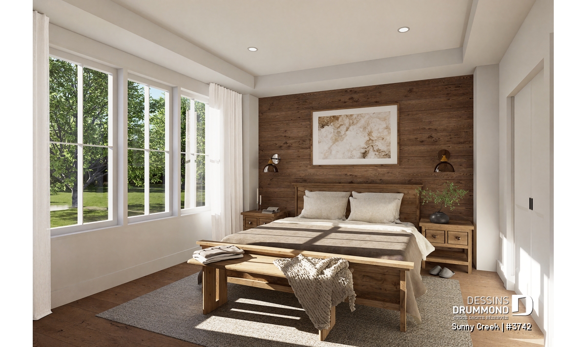 Chambre des maîtres au rez-de-chaussée avec walk-in et accès à une salle de bain complète.