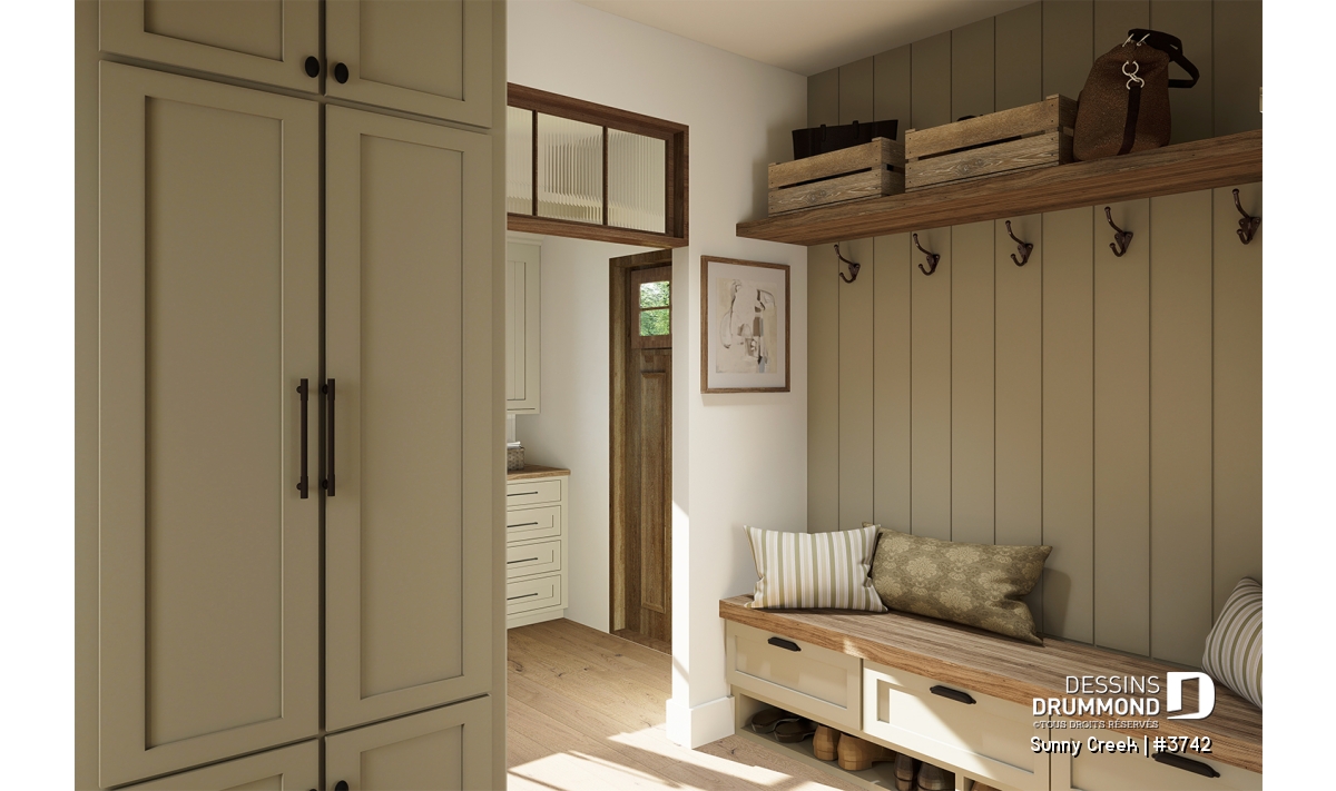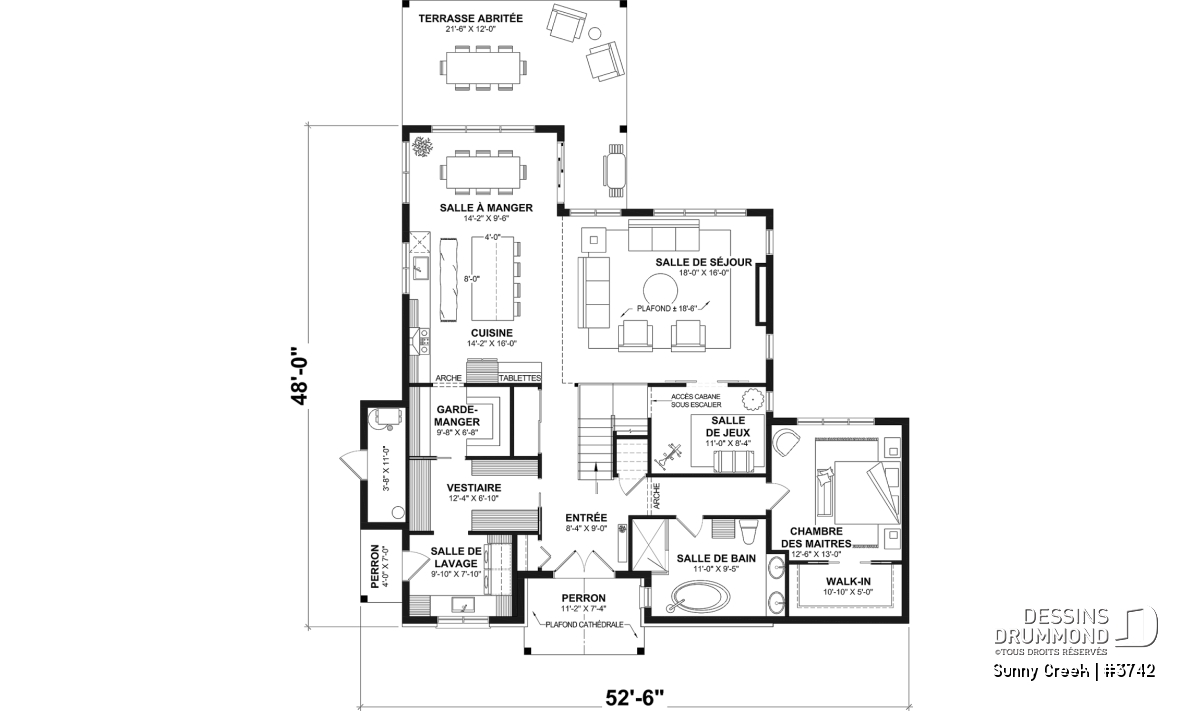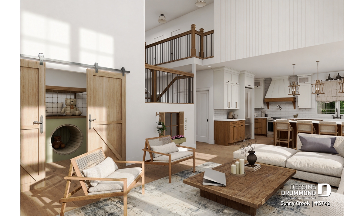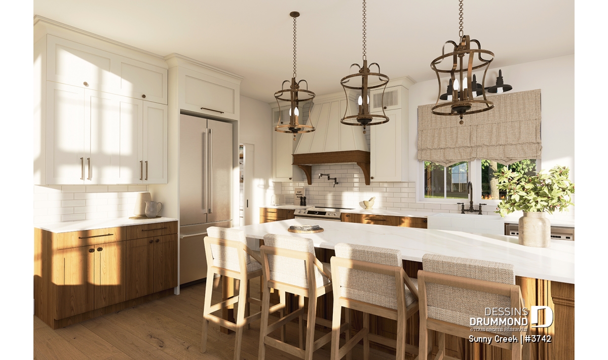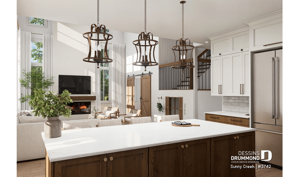 Aire ouverte, Arche, Tablettes, Salle de lavage au rez-de-chaussée, Terrasse abritée, Vestiaire, Vue paronamique, Walk-in ch. maîtres, Bain et douche séparés, Lavabo double, Garde-manger, Plafond à plus de 8', Plafond cathédrale, Meuble(s) encastré(s), Ilôt, Coin bureau, Salle de jeux