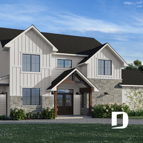 Découvrez ce magnifique plan de maison à étage de style Farmhouse, pensé pour allier charme rustique et confort moderne. Dès le premier regard, sa façade harmonieuse séduit par la combinaison élégante de pierres et de revêtement board & batten, offrant à la fois authenticité et raffinement. Cette allure semi-rustique s’intègre à merveille dans un cadre champêtre ou résidentiel et promet un coup de cœur assuré pour tous ceux qui franchiront votre allée.