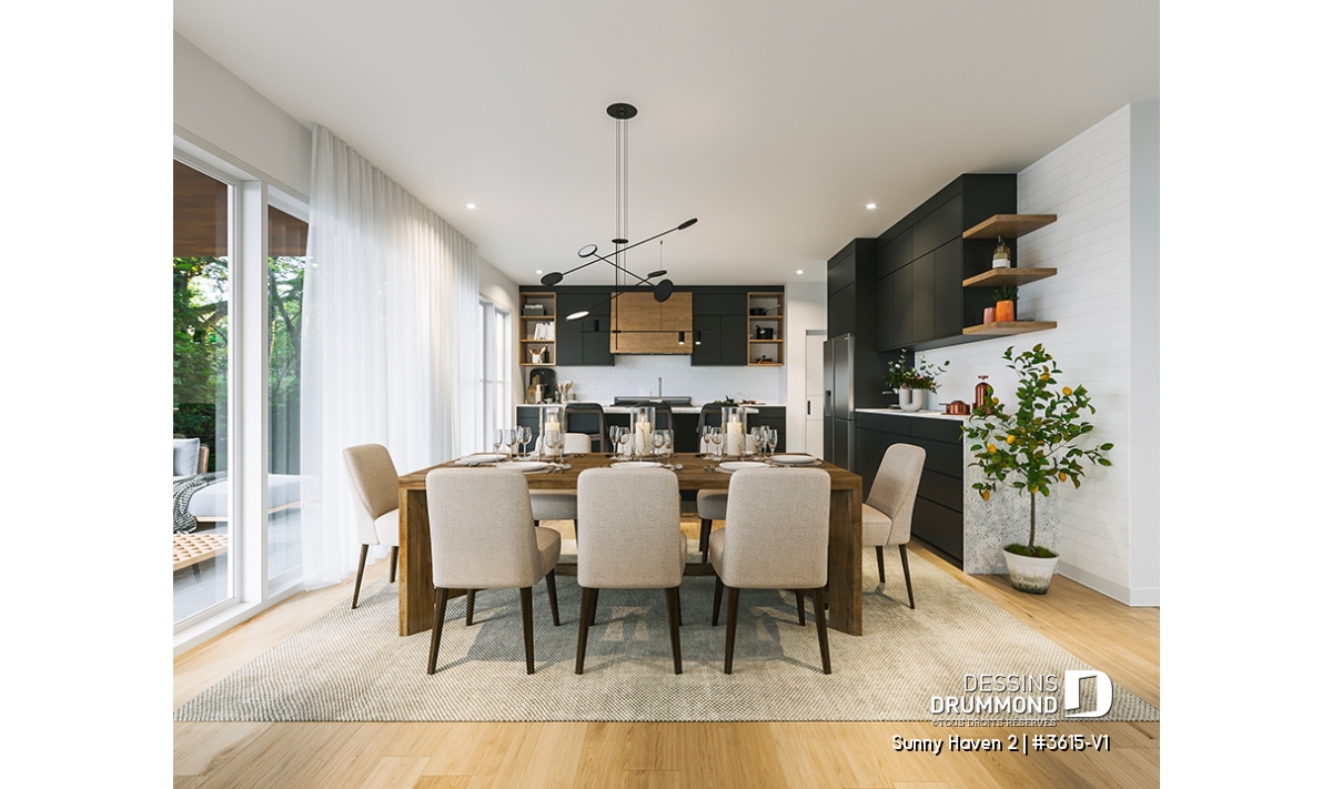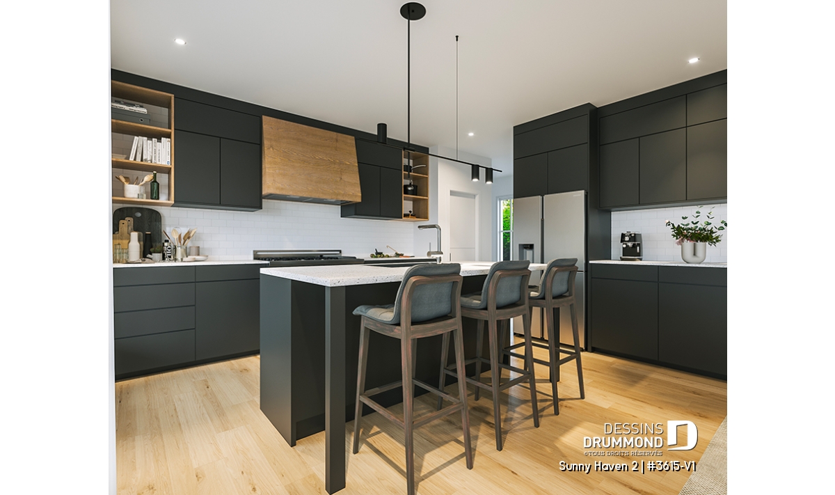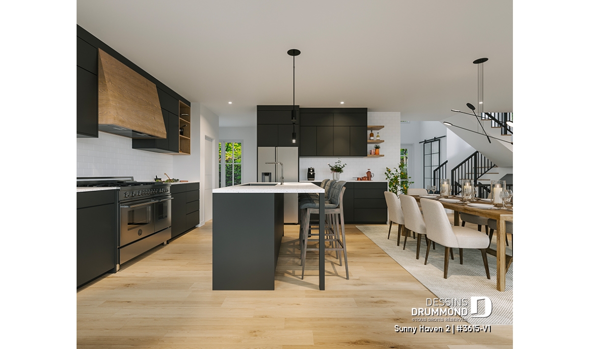 Aire ouverte, Entrée ouverte sur 2 étages, Salle de lavage au rez-de-chaussée, Suite des maîtres à l'étage, Ilôt, Garde-manger, Vestiaire, Bureau / Salle étude, Foyer, Walk-in ch. maîtres, Salle de bain communicante, Plafond à plus de 8', Plafond cathédrale, Bain et douche séparés, Bar à café, Garage spacieux, Mezzanine, Terrasse abritée, Chute à linge, Porte(s) de grange, Banquette
