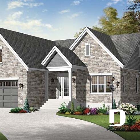 Plan de maison de plain-pied, 2 chambres, garage double avec espace boni, belle fenestration