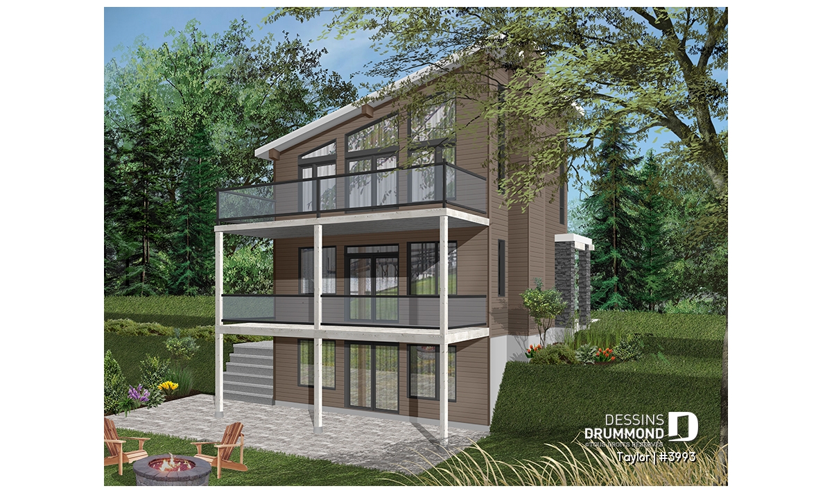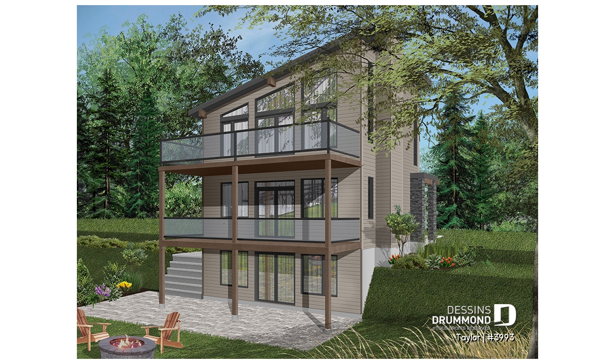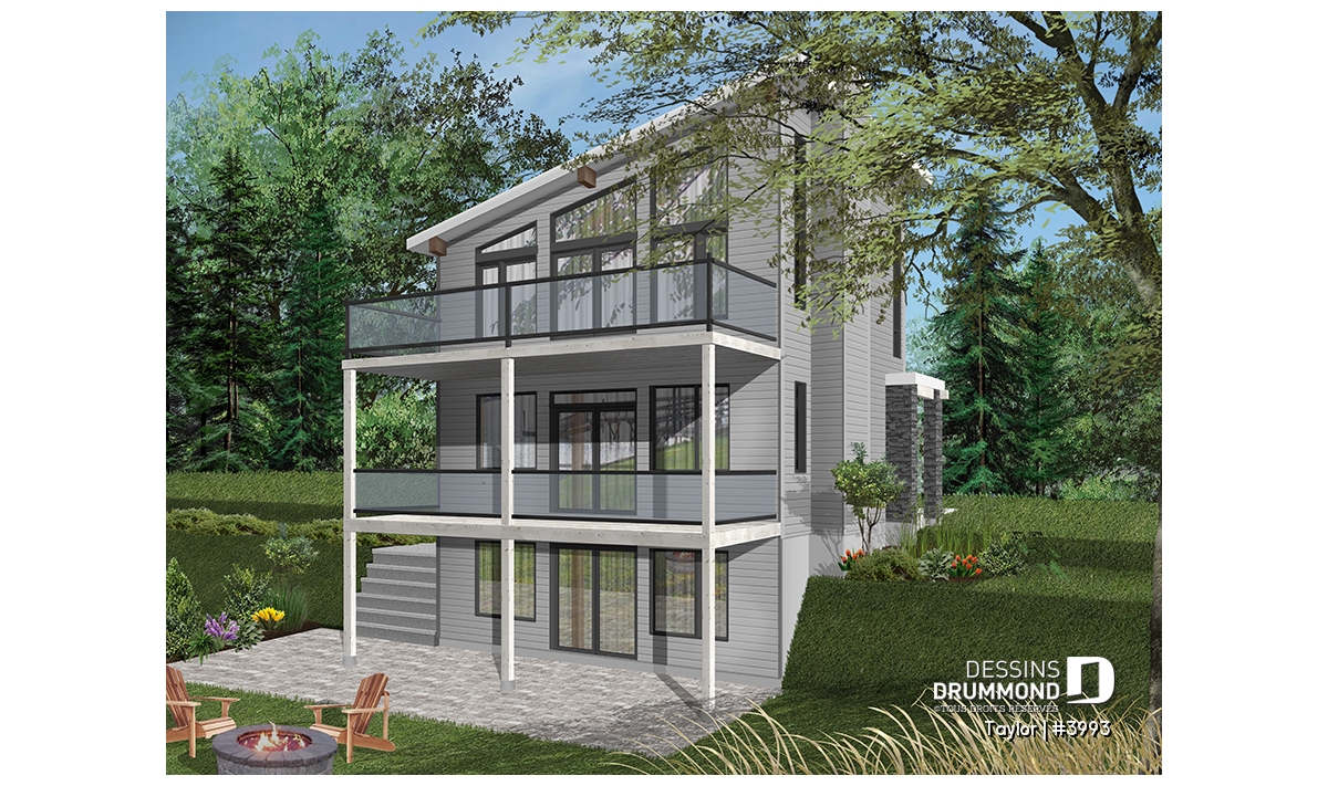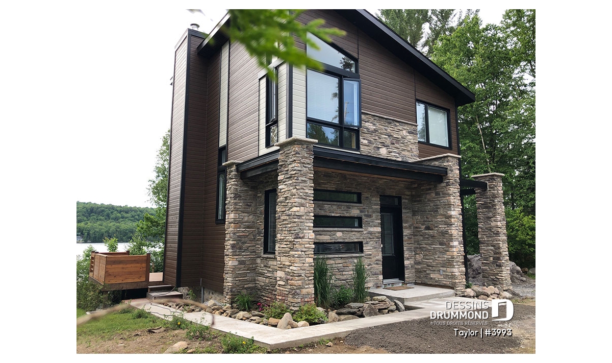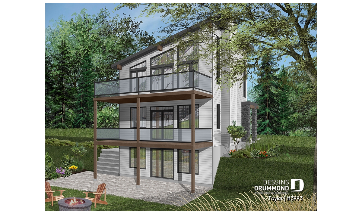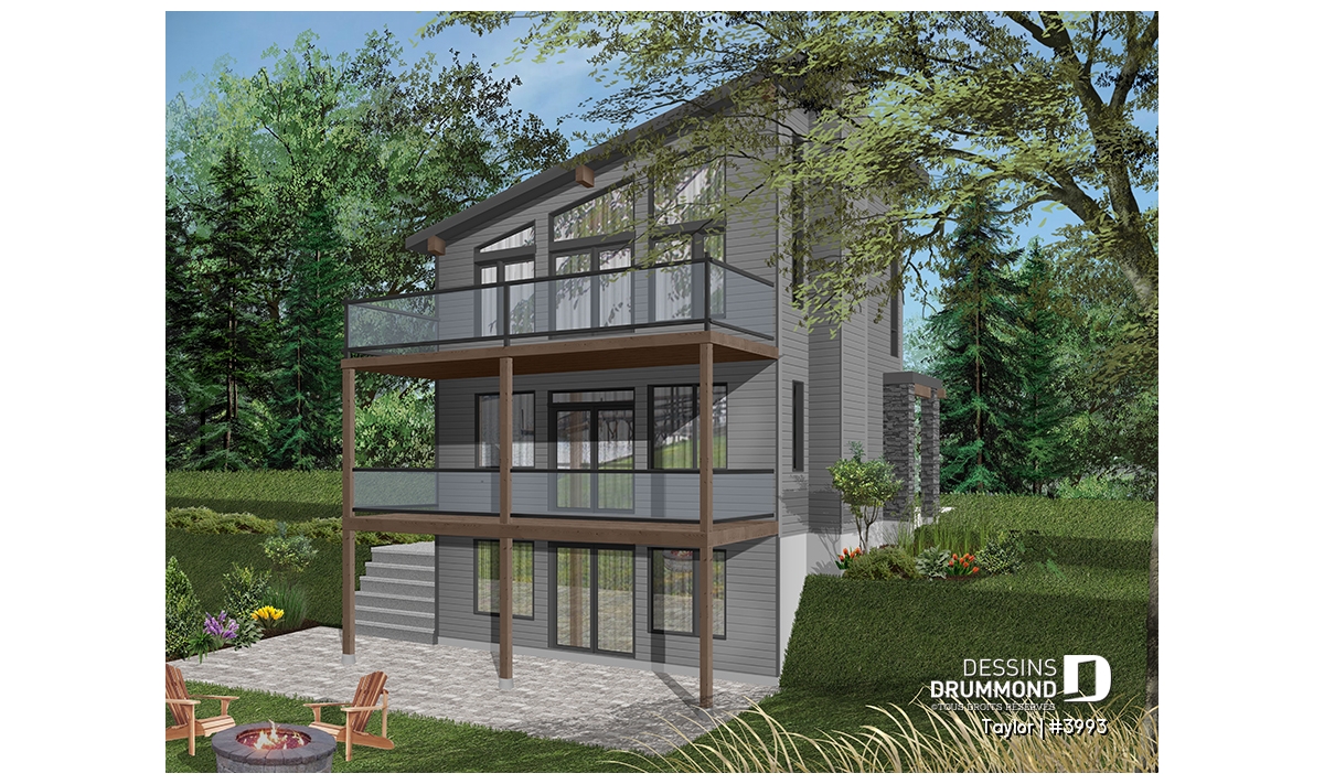 Le nouveau plan de chalet contemporain de Dessins Drummond (plan # 3993) aussi nommé « Taylor », charme dans un premier temps par la quantité impressionnante de fenêtres et portes qu’il offre aux futurs propriétaires. Ces ouvertures ainsi proposées permettent une maximisation de la lumière naturelle et ce dans plusieurs pièces clé de la maison, soit le secteur activités à l’arrière, ainsi qu’à la chambre des maîtres. Que ce soit à la campagne en bordure d’un boisé, au bord d’un lac ou d’une rivière, ou en montagne, le nouveau plan de chalet de Dessins Drummond « Taylor » vous fera profiter au maximum des vues disponibles de votre nouveau terrain.