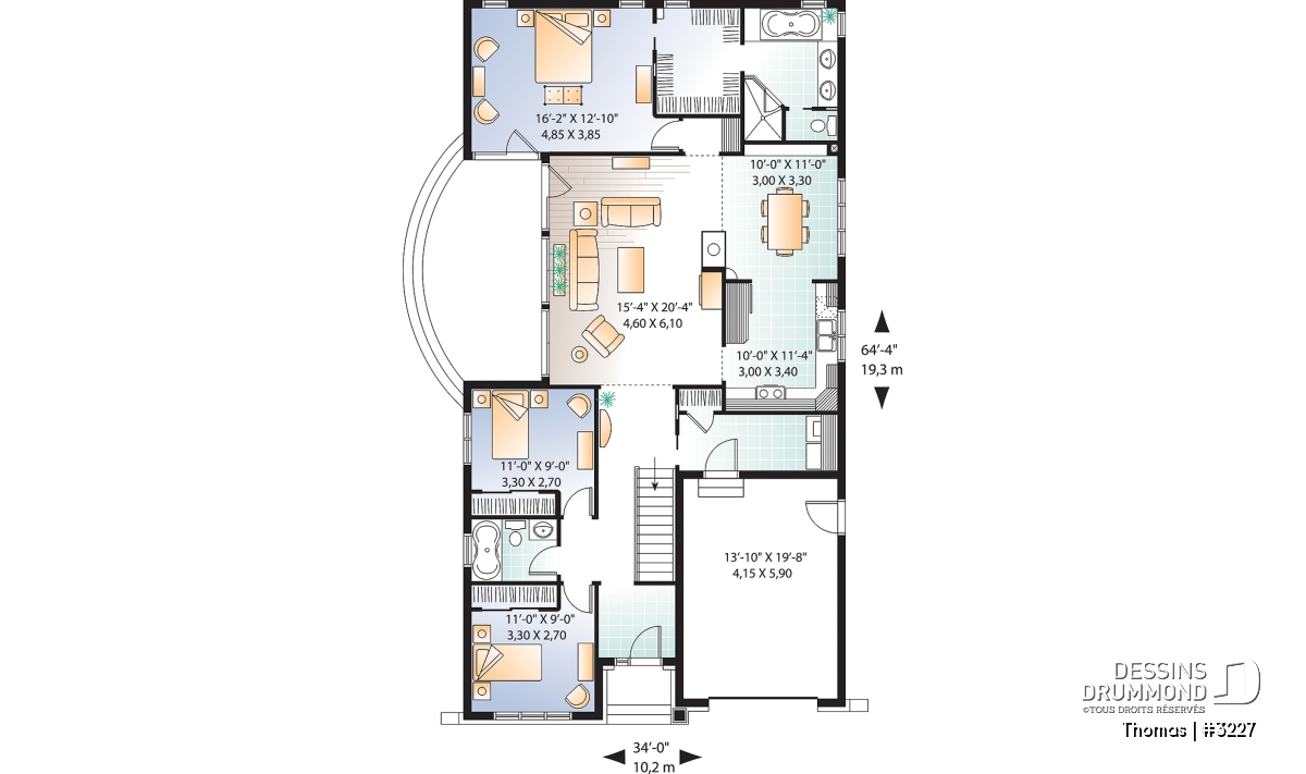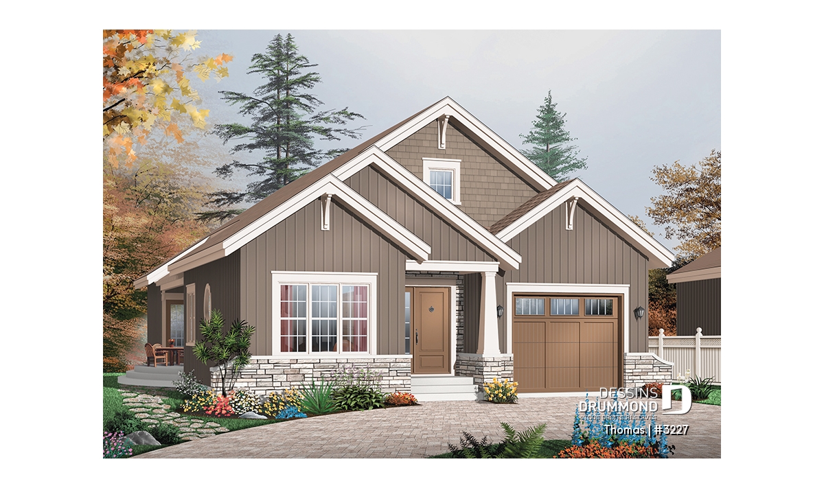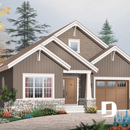 Voici un beau modèle de maison de style Craftsman avec garage, idéal pour un terrain étroit car la largeur de la maison est de 34 pieds. Les plafond sont à 9 pi sur tout le rez-de-chaussée et à 12 pi à la salle de séjour. Le séjour est doté d'une fenestration abondante, avec accès à un grand patio, idéale pour les terrains sur le bord d’un lac ou offrant une vue panoramique de côté. La superbe suite chambre des maîtres possède un walk-in et une grande salle de bain privée, et offre un accès à la grande terrasse latérale. La cuisine, la salle à dîner et le salon ont à aire ouverte et se partage un foyer central.