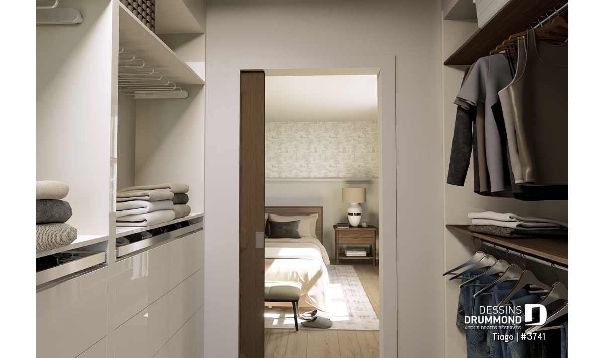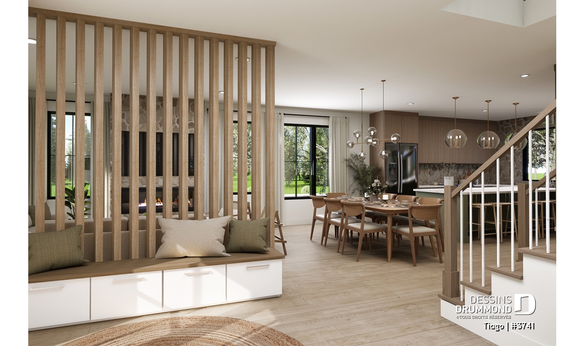 Dès l’entrée, vous serez accueilli par un spacieux vestiaire sur la droite et un banc pratique sur la gauche. Le salon, chaleureux et convivial, est agrémenté d’un foyer et peut accueillir plusieurs aménagements de soffas et fauteuils. La cuisine à aire ouverte donne sur la salle à manger et met en valeur un trio très prisé : garde-manger, cellier et grand îlot central. Un bureau, idéal pour le télétravail, complète cet espace et peut aisément être transformé en salle de jeux pour les enfants. Une salle d’eau, située à mi-palier vers le sous-sol, vient parfaire cet étage.