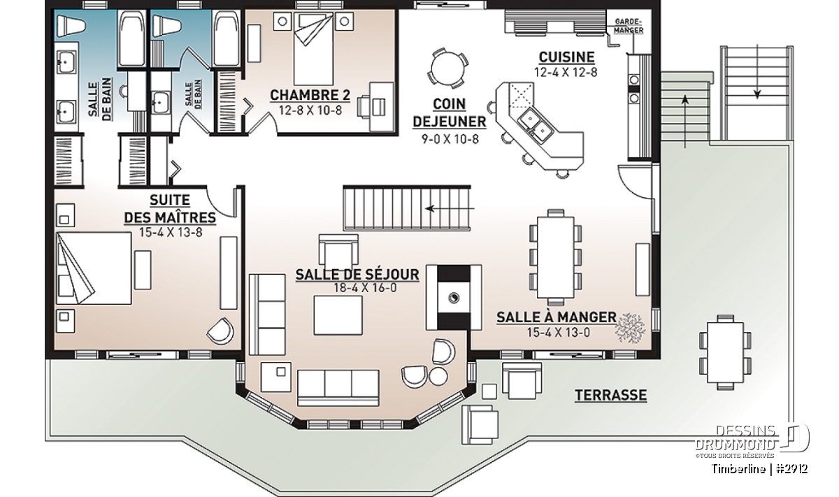 Plafond cathédrale prévu à la salle de séjour dotée aussi d'un foyer deux faces ouvert sur la salle à manger. Cuisine avec garde-manger en coin et îlot-lunch central. Suite des maîtres prévue au rez-de-chaussée. Salle familiale avec foyer. Cinq chambres prévues au plan. Garage double avec terrasse au-dessus.
