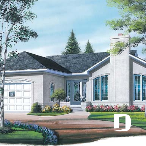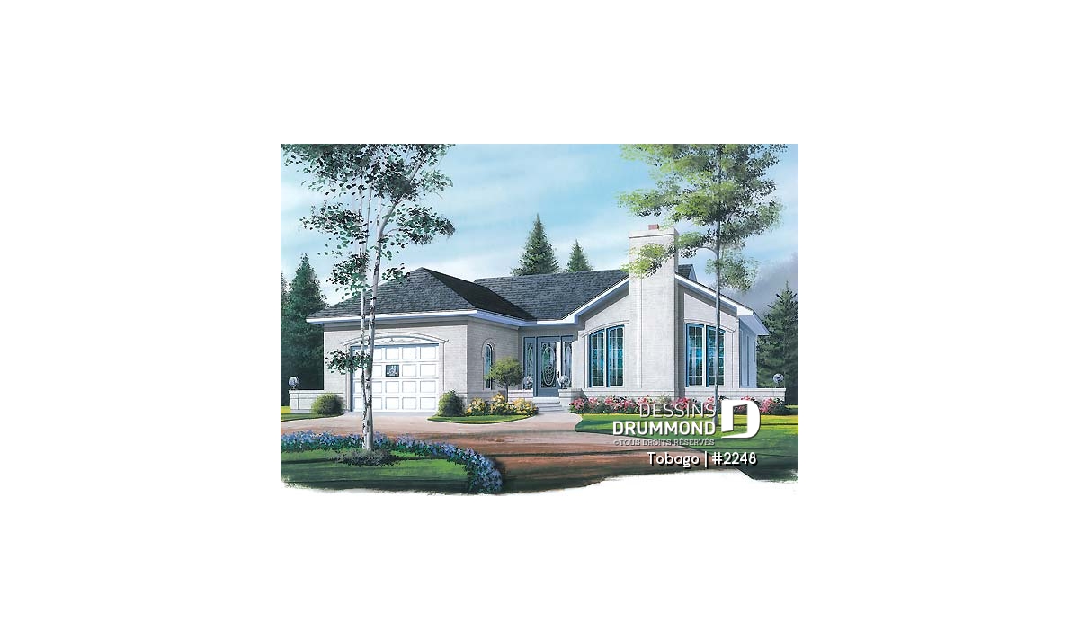 Plan de style américain, 2 chambres, foyer au salon, grande cuisine, éviers doubles à la salle de bain, garage