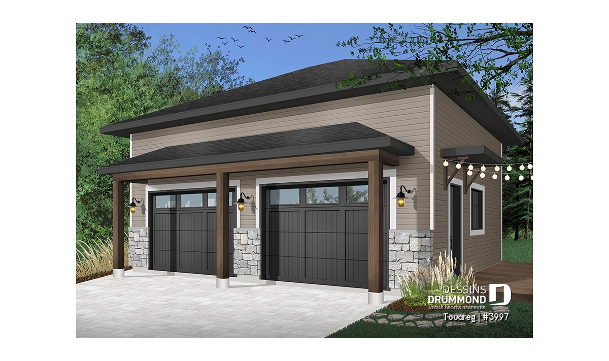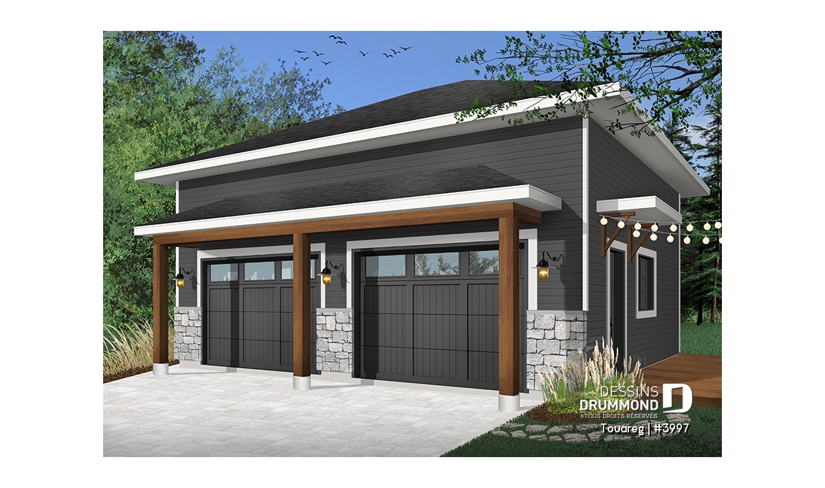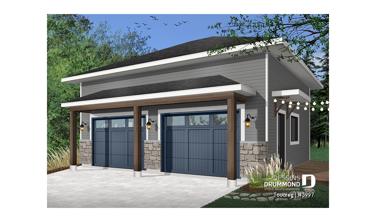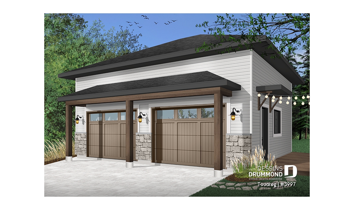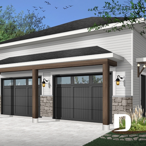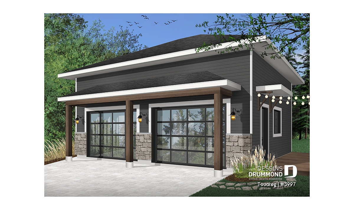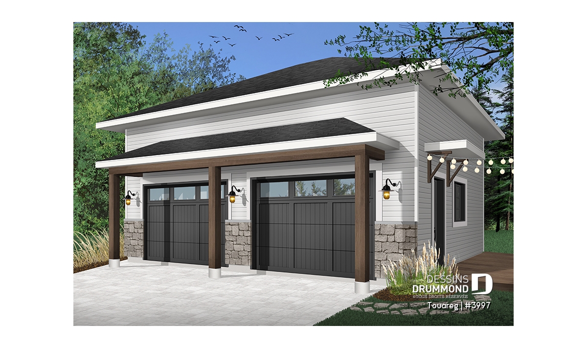 Plan de garage double, style moderne rustique, plafond à 12 pieds.