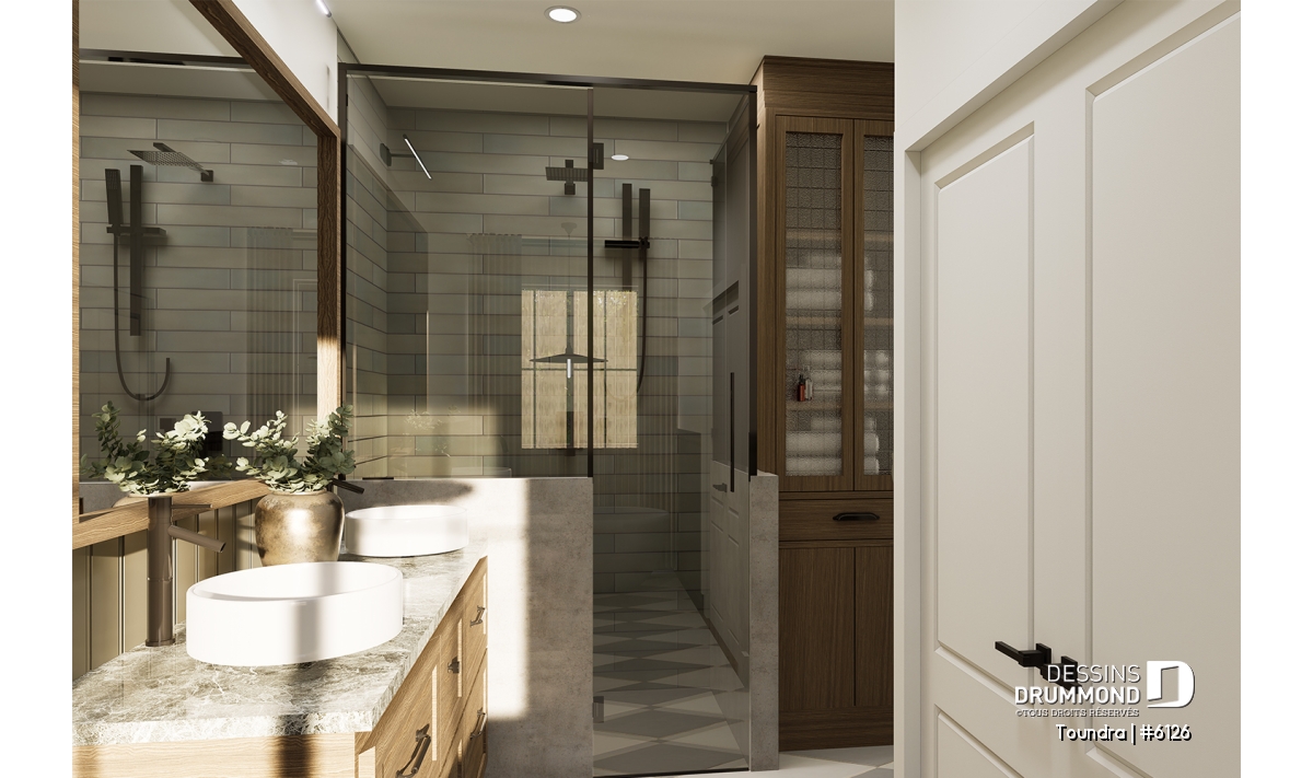 La salle de bain spacieuse a tout pour plaire : bain autoportant pour les moments de détente, douche indépendante vitrée, double lavabo et un coin laveuse/sécheuse superposées, ingénieusement intégré pour un maximum d’efficacité.
