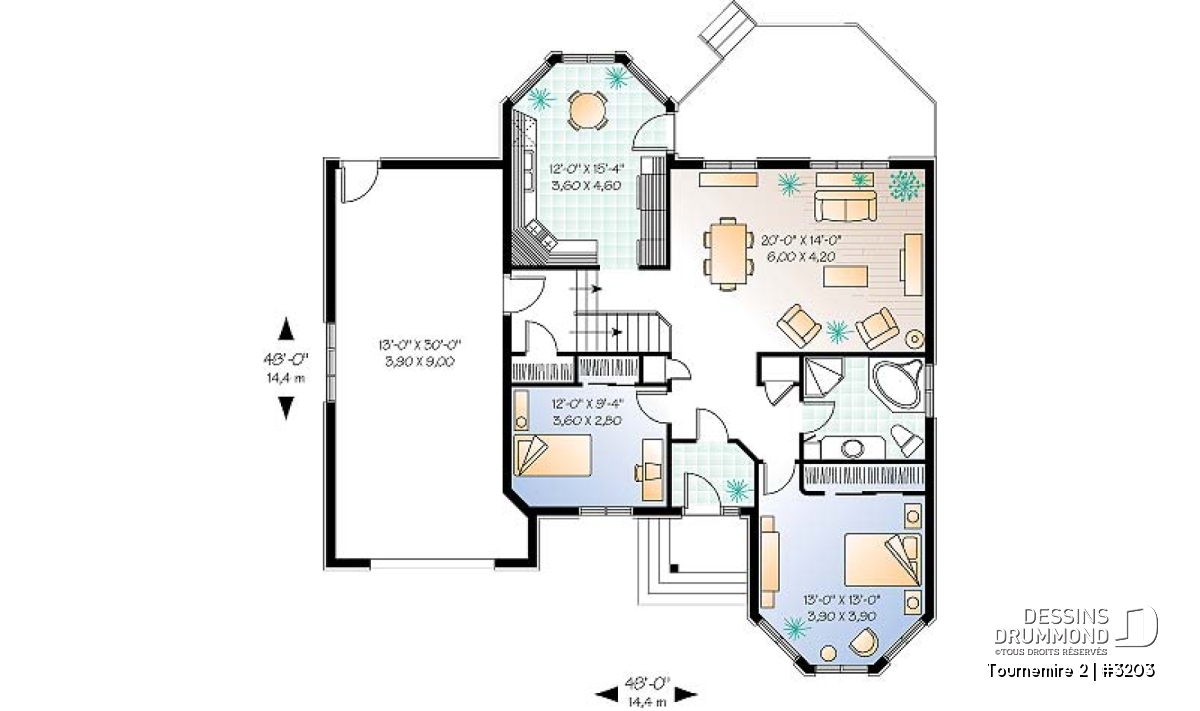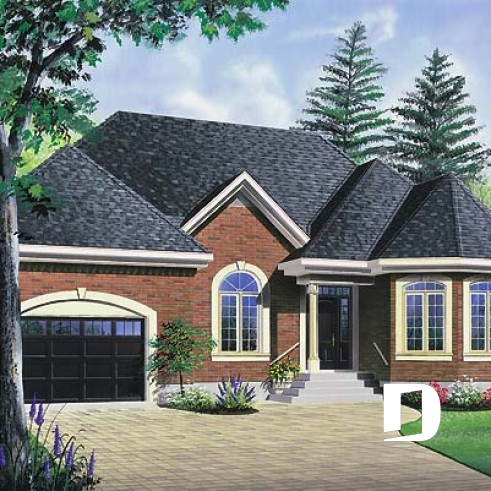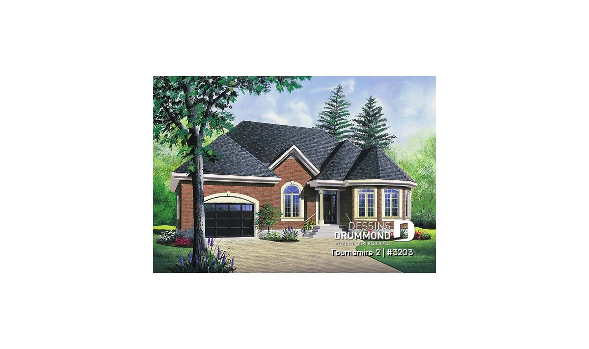 Habillé de brique aux quatre façades, ce plain-pied se veut une valeur sûre. Un garage suffisamment confortable et deux aménagements intérieurs différents le démarquent de bien d’autres. Un perron avant accessible sur deux faces nous donne accès à l’entrée principale ouvrant dans les deux cas sur un vestibule. Des formes arrondies tant à l’avant qu’à l’arrière de la maison permettent à celle-ci d’offrir pour chacune des propositions un éclairage abondant aux chambres des maîtres, au coin dînette (3203) et à la salle de séjour (3202).