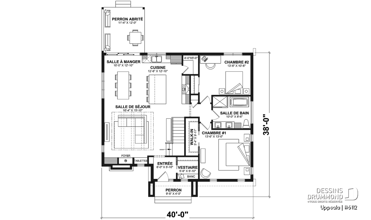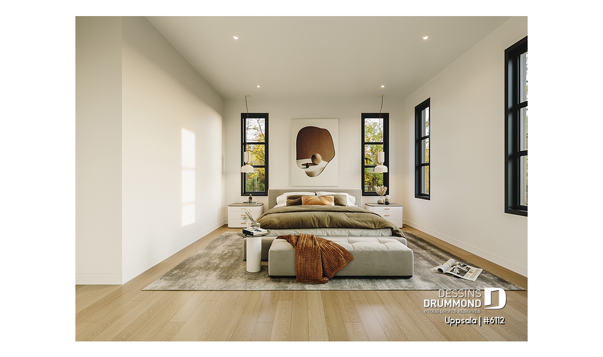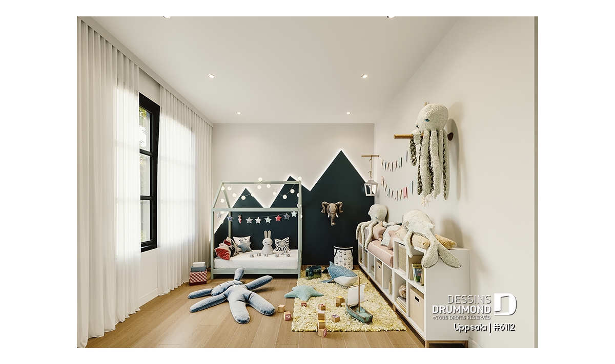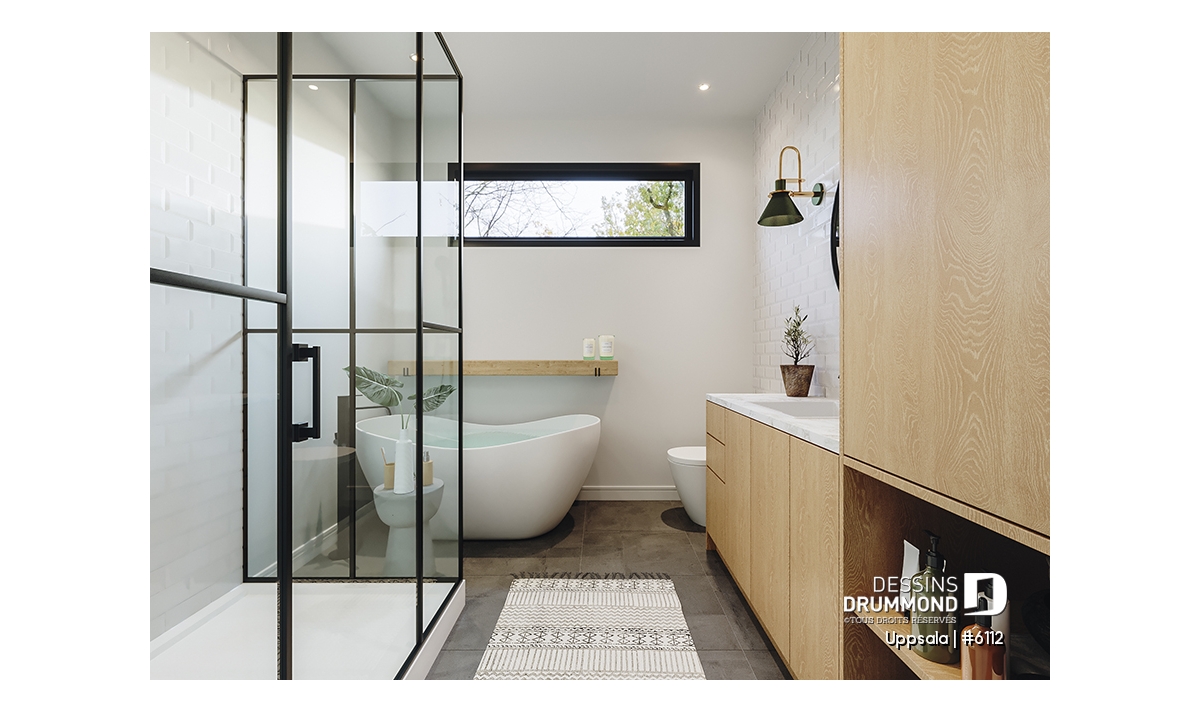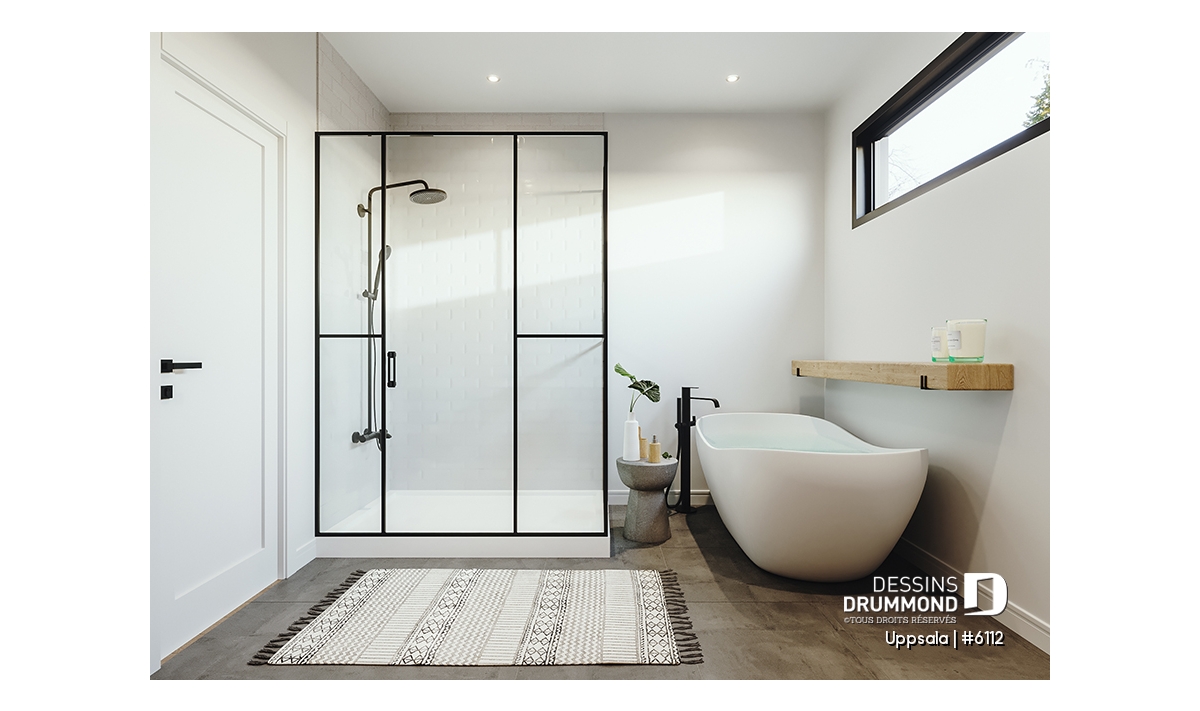 Le plan dont il est question ici, UPPSALA (#6112) regroupe tous les éléments recherchés par les familles avec 2+ enfants ou adolescents. En entrée, vous vous retrouvez dans un vestibule fermé avec vestiaire de style walk-in et banc.