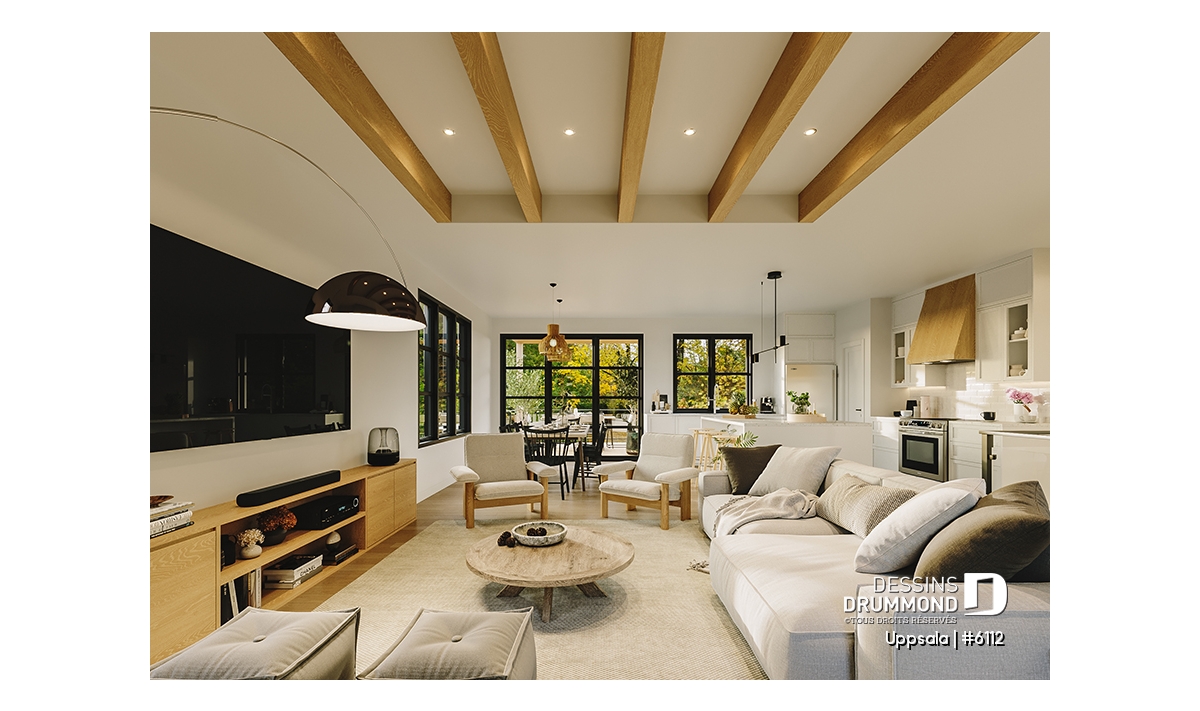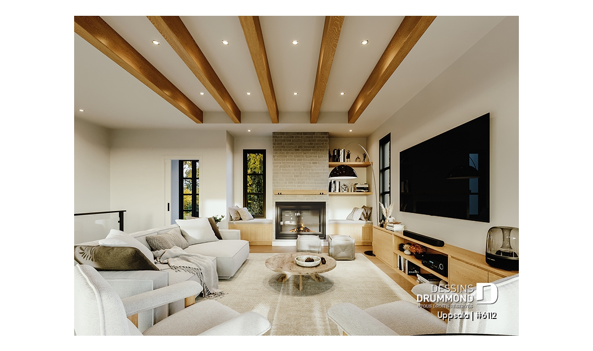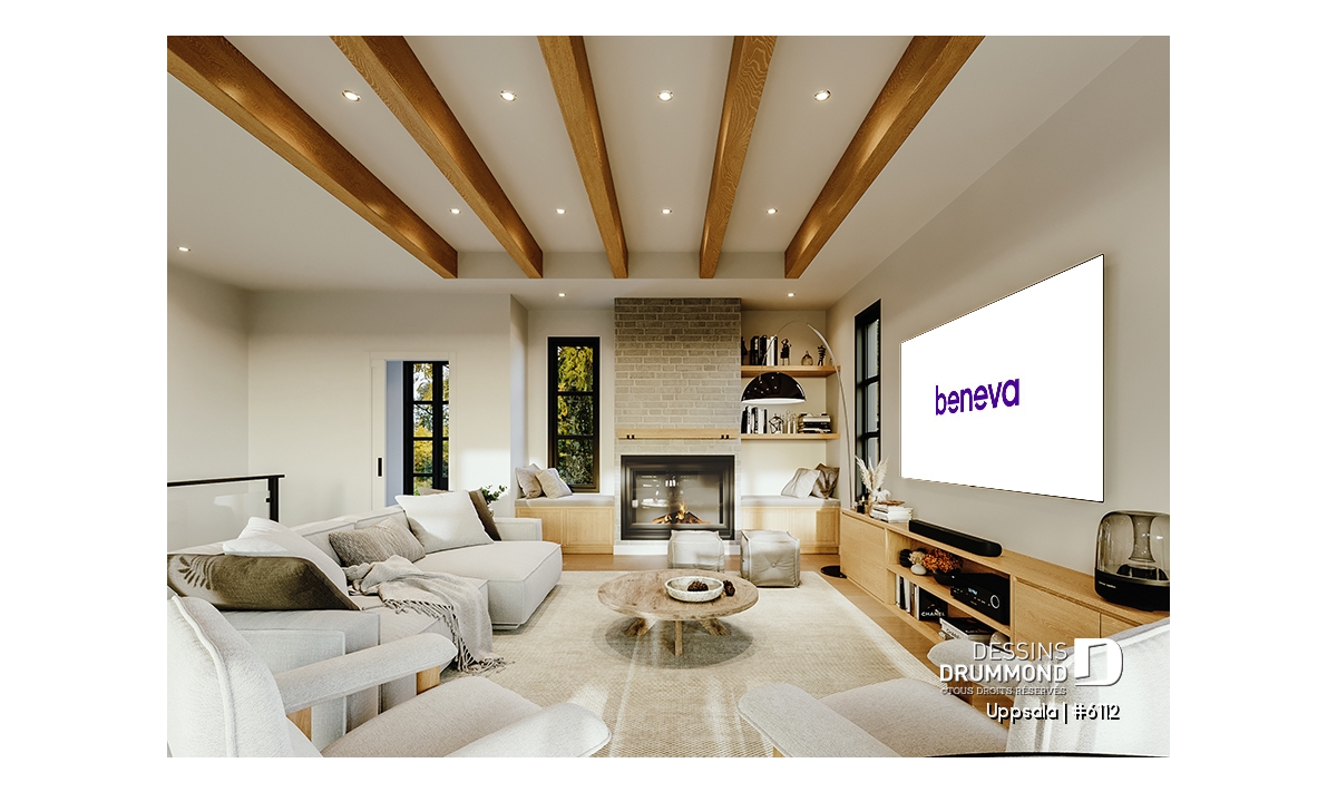 Plafond à 9' sur tout le rez-de-chaussée sauf au salon où il est à plus de 10'. Noter que le coût des poutres aménagées au salon n'est pas inclus dans notre estimation de coût de construction pour ce modèle.