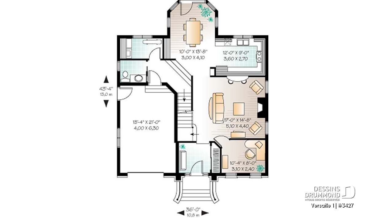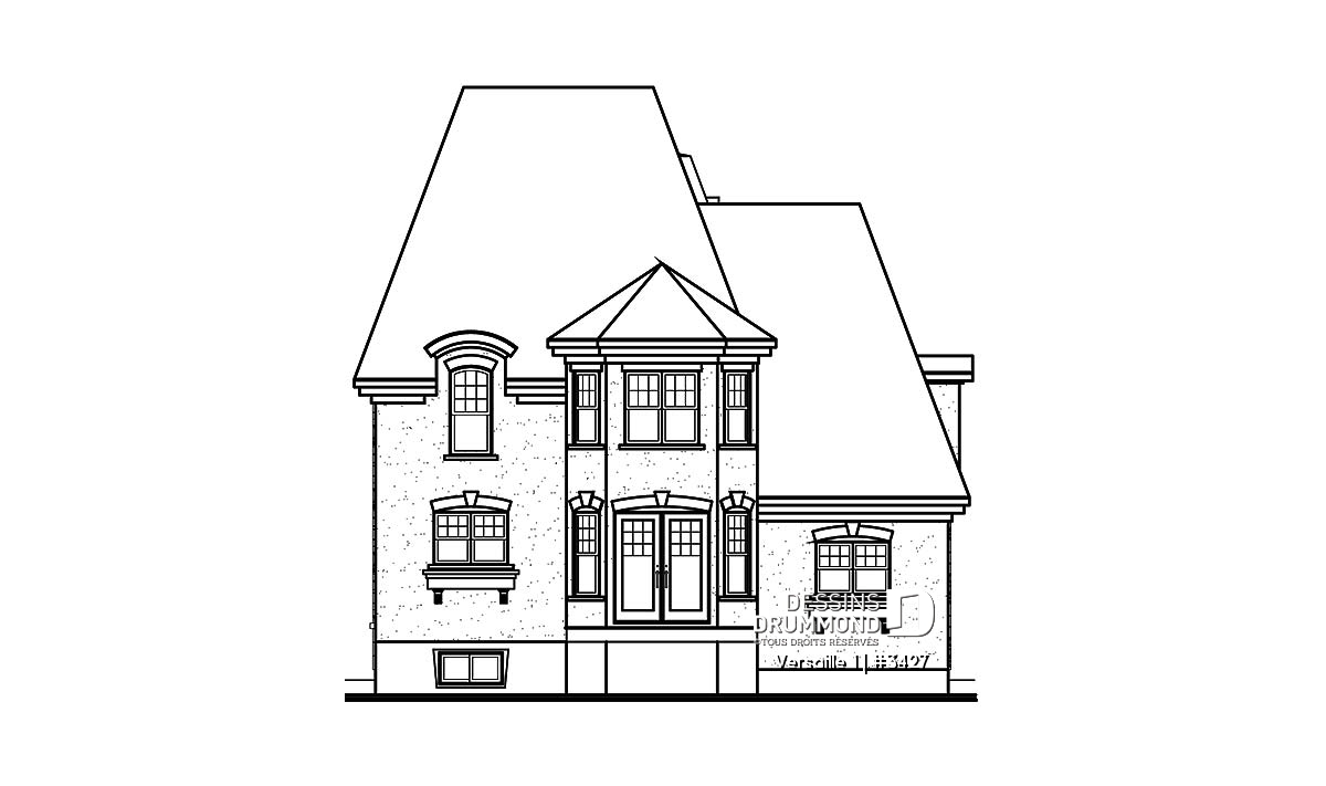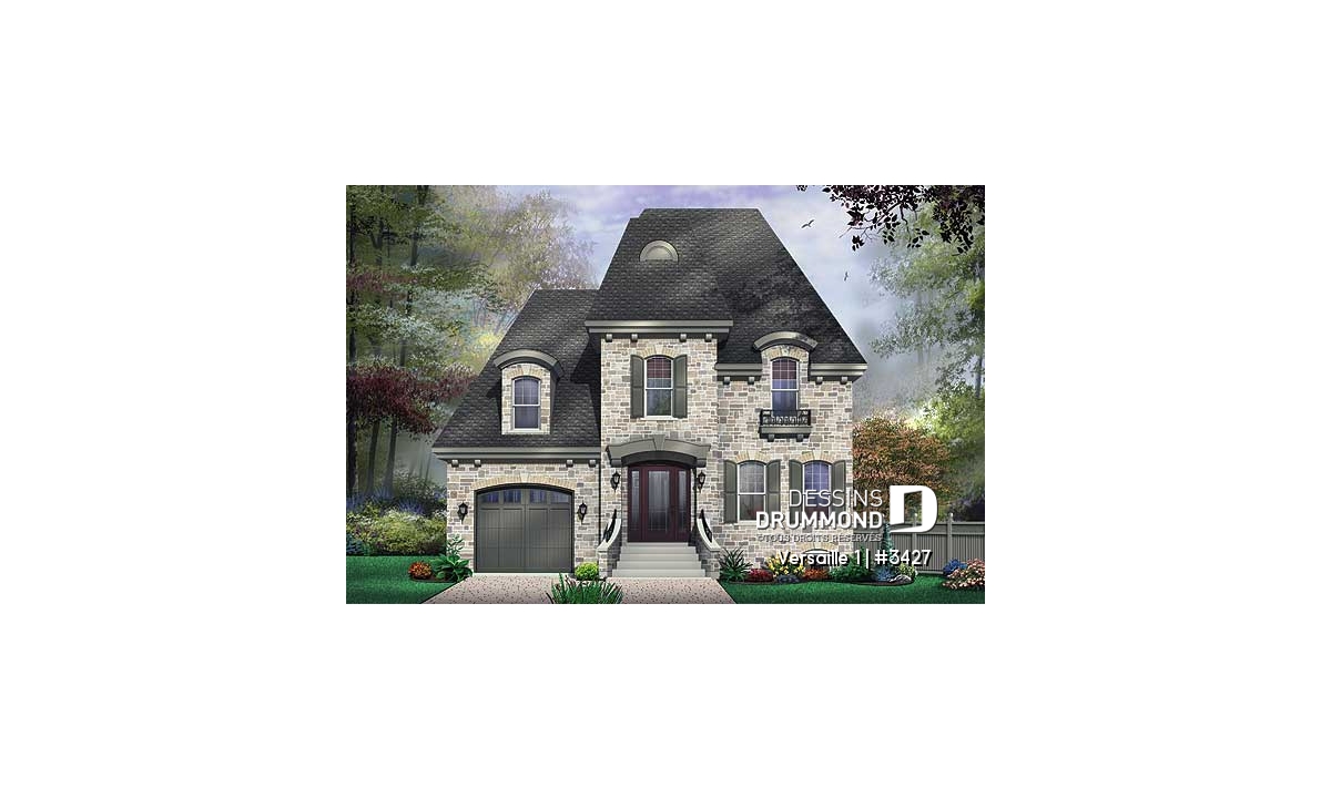 Empruntant aux manoirs de beaux éléments d’architecture tels les jeux de pierres aux corniches, la tour carrée en façade et la porte principale en retrait, ce modèle se veut idéal pour les lots étroits si nombreux en ce moment.