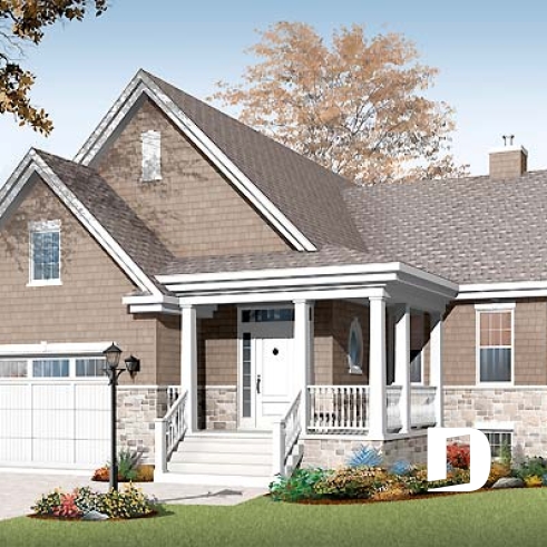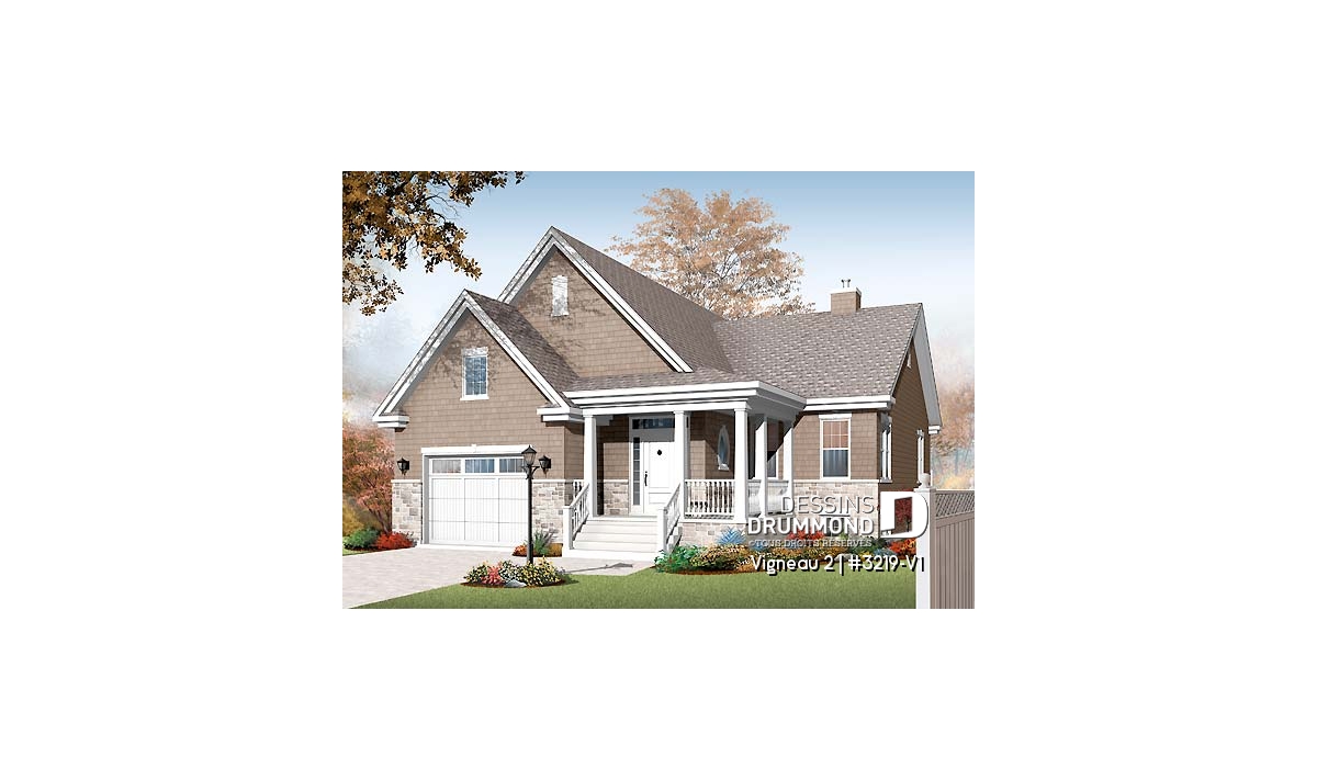 Vue avant - MODÈLE DE BASE - Plan de plain-pied avec sous-sol aménagé, 2 à 4 chambres, 2 salles de bain, grande cuisine, foyer - Vigneau 2