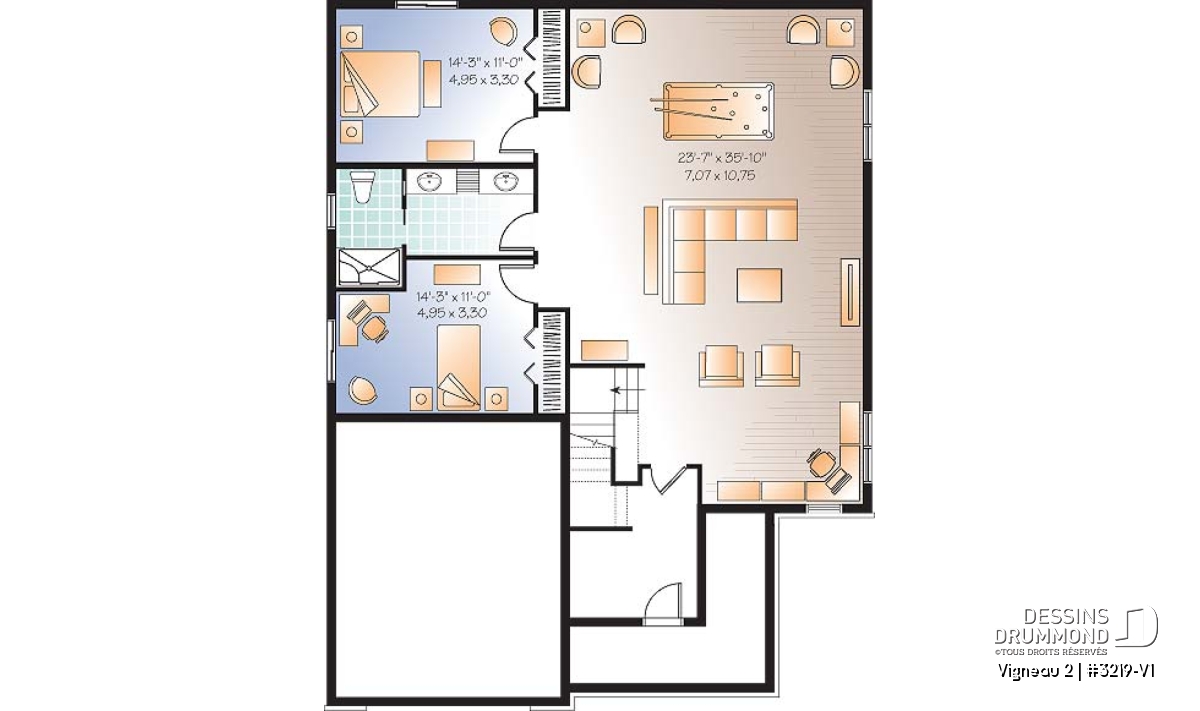 Sous-sol - Plan de plain-pied avec sous-sol aménagé, 2 à 4 chambres, 2 salles de bain, grande cuisine, foyer - Vigneau 2