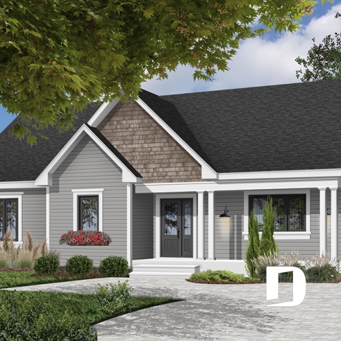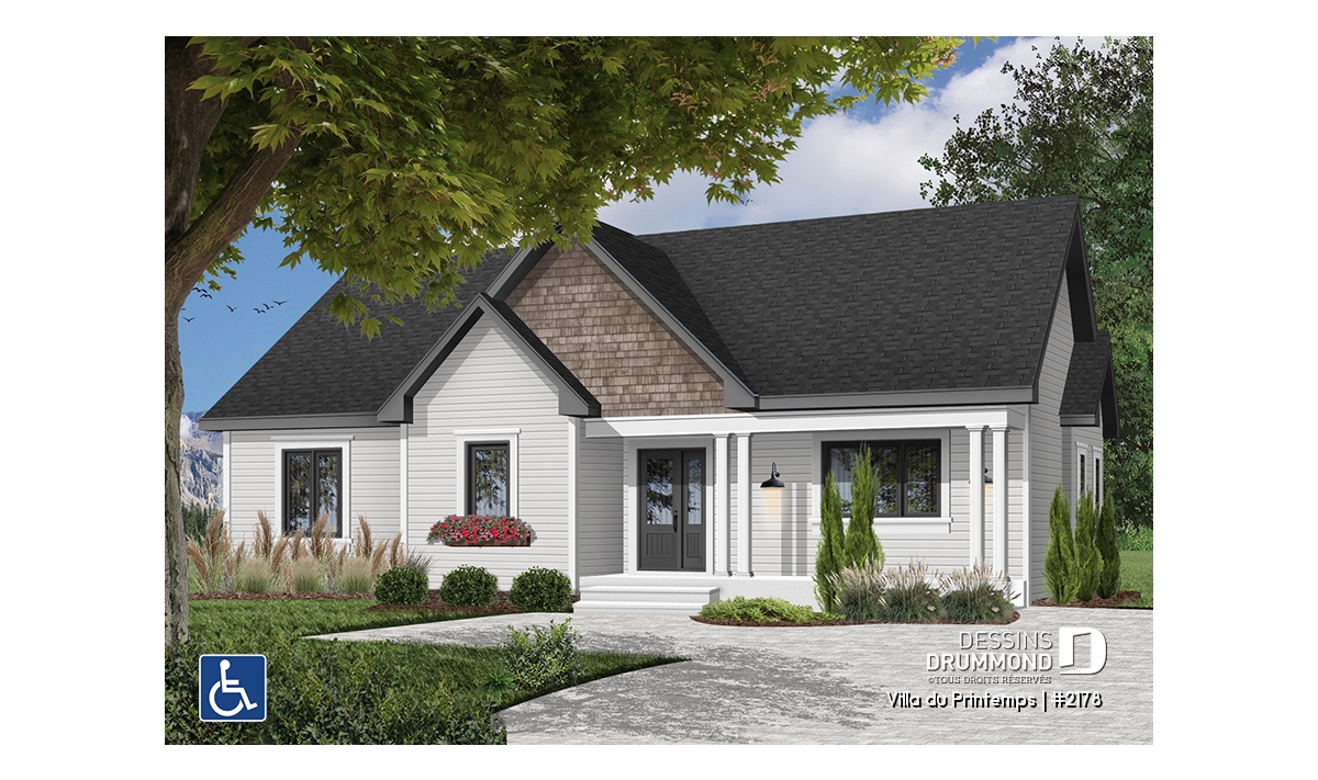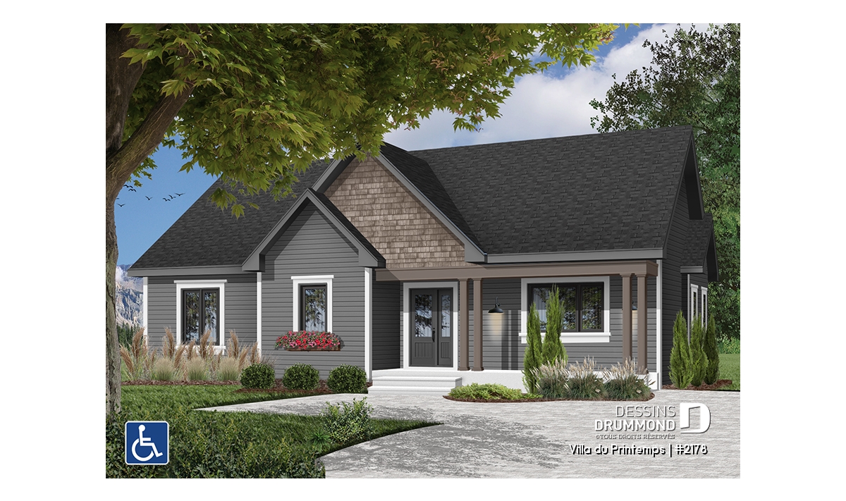 Rampe d'accès bien abritée donnant à la porte avant, porte-patio 8' 0" à la salle à manger, escalier pour le sous-sol muni d'un élévateur adapté pour personne en fauteuil roulant.