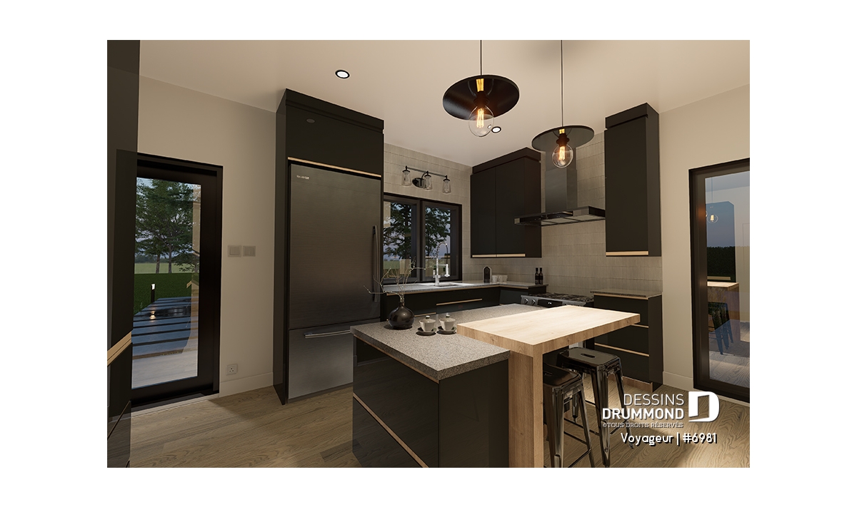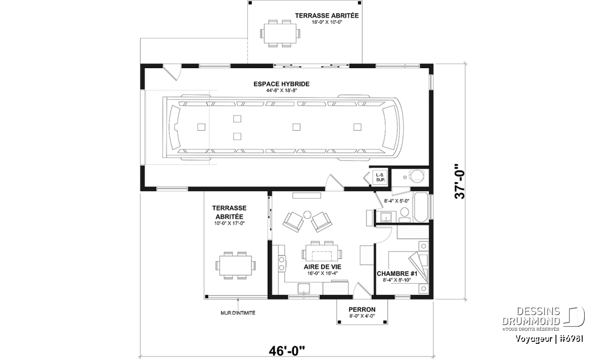 Le plan de base propose un petit concept à aire ouverte pour la cuisine et la salle de séjour et malgré son petit format il offre tout de même 2 belles grandes terrasses abritées, et un grand garage pour VR de 44'8'' X 18'8''.