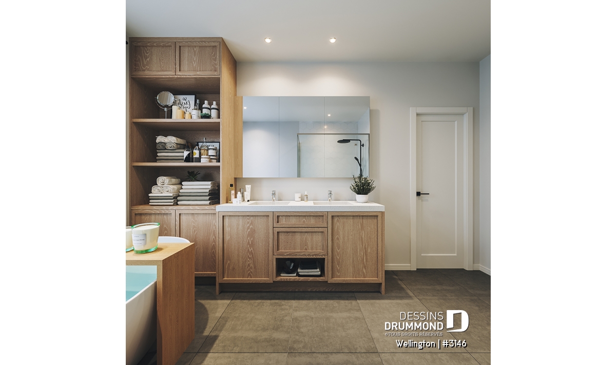 La salle de bain familiale au rez-de-chaussée est un autre point fort de la maison : deux lavabos, un bain confortable, une douche indépendante moderne, ainsi qu’une chute à linge intégrée menant directement à la salle de lavage située au sous-sol — un détail pratique qui facilite la gestion du quotidien.