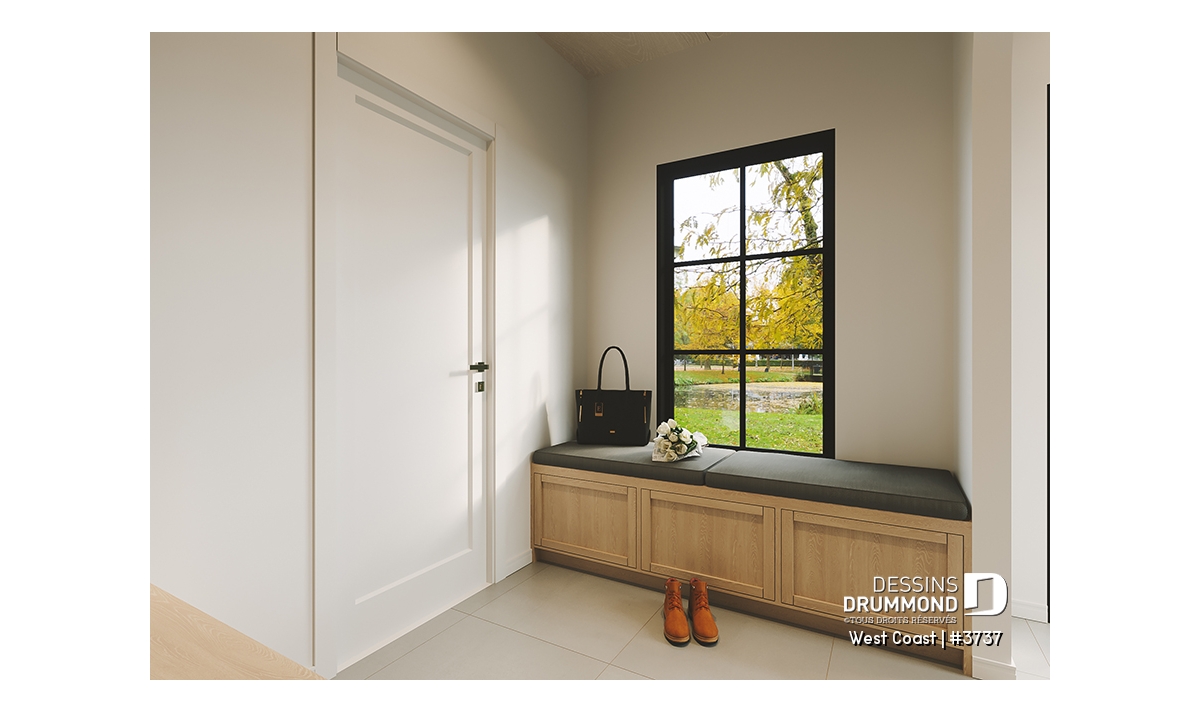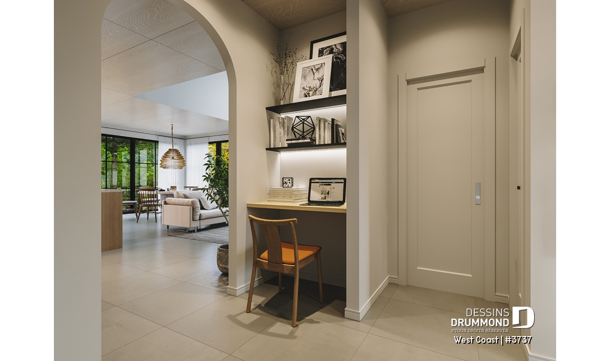 L’entrée accueillante s’ouvre sur un vaste vestiaire pratique, idéal pour organiser manteaux et accessoires, et donne accès directement au garage. Cet espace comprend un coin salle mécanique, parfait pour ranger outils et équipements de jardinage et autres. À proximité, une salle d’eau et un coin bureau sont judicieusement situés en retrait des aires de vie, offrant intimité et tranquillité pour le télétravail.