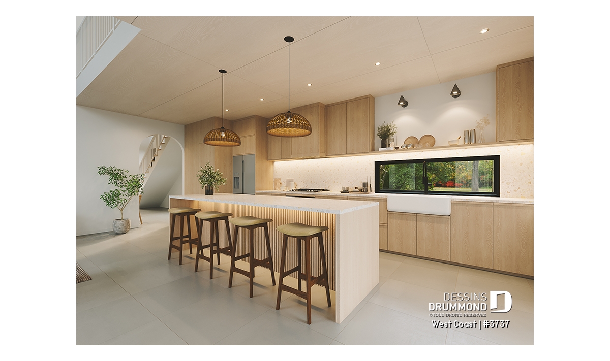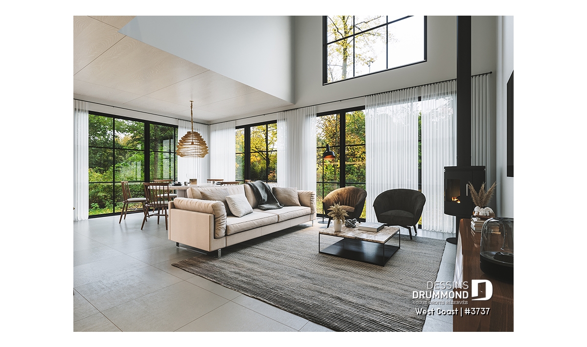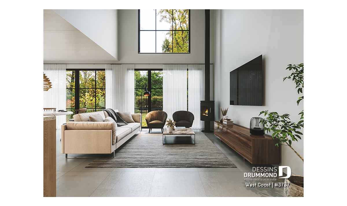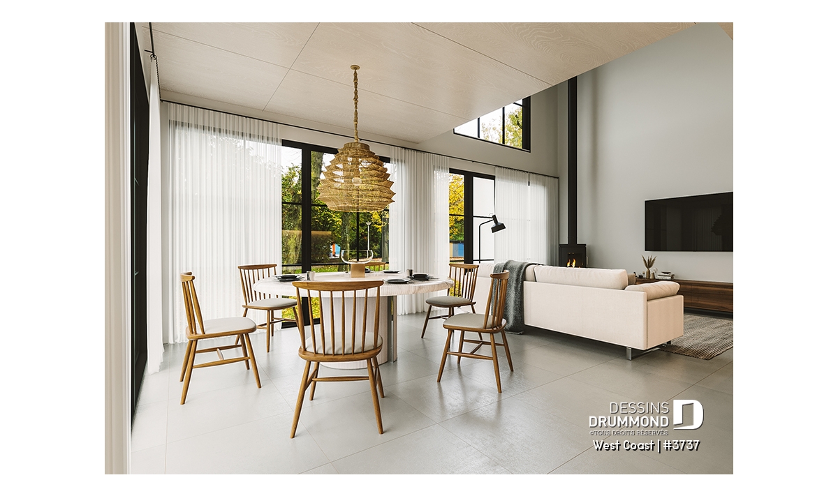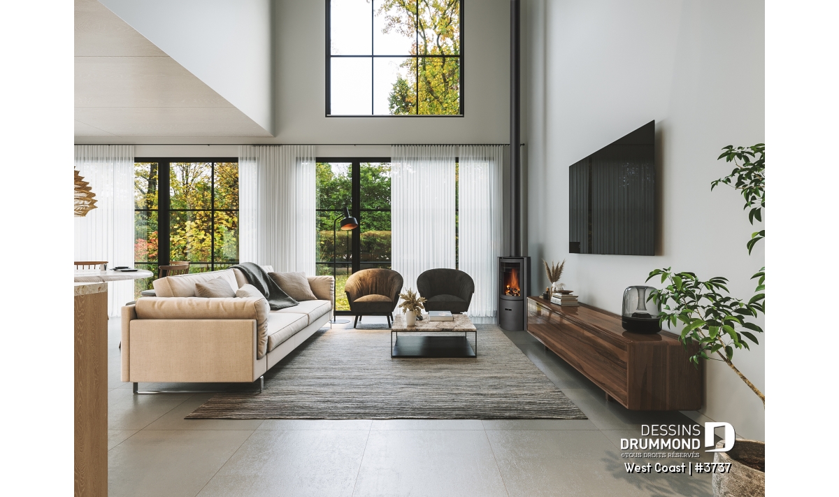 La cuisine, véritable cœur de la maison, est dotée d’un grand îlot rassembleur et d’un garde-manger fonctionnel. Elle s’ouvre sur une salle à manger lumineuse qui donne sur la cour latérale, créant un espace propice aux repas en famille et aux réceptions entre amis. Le salon, quant à lui, impressionne par son plafond spectaculaire de plus de 18’4’’ visible de la mezzanine à l’étage. C’est dans ce vaste espace que trône le poêle à bois STÛV modèle s30C, prévu près du téléviseur, apportant chaleur et ambiance scandinave tout au long des saisons froides.