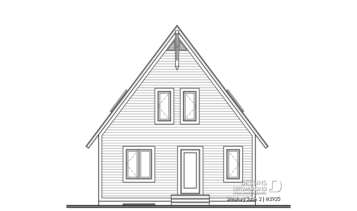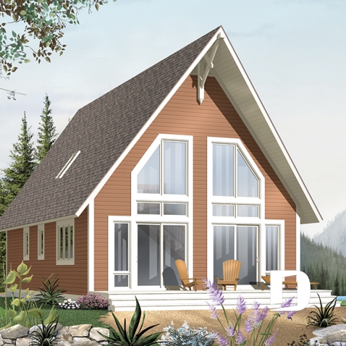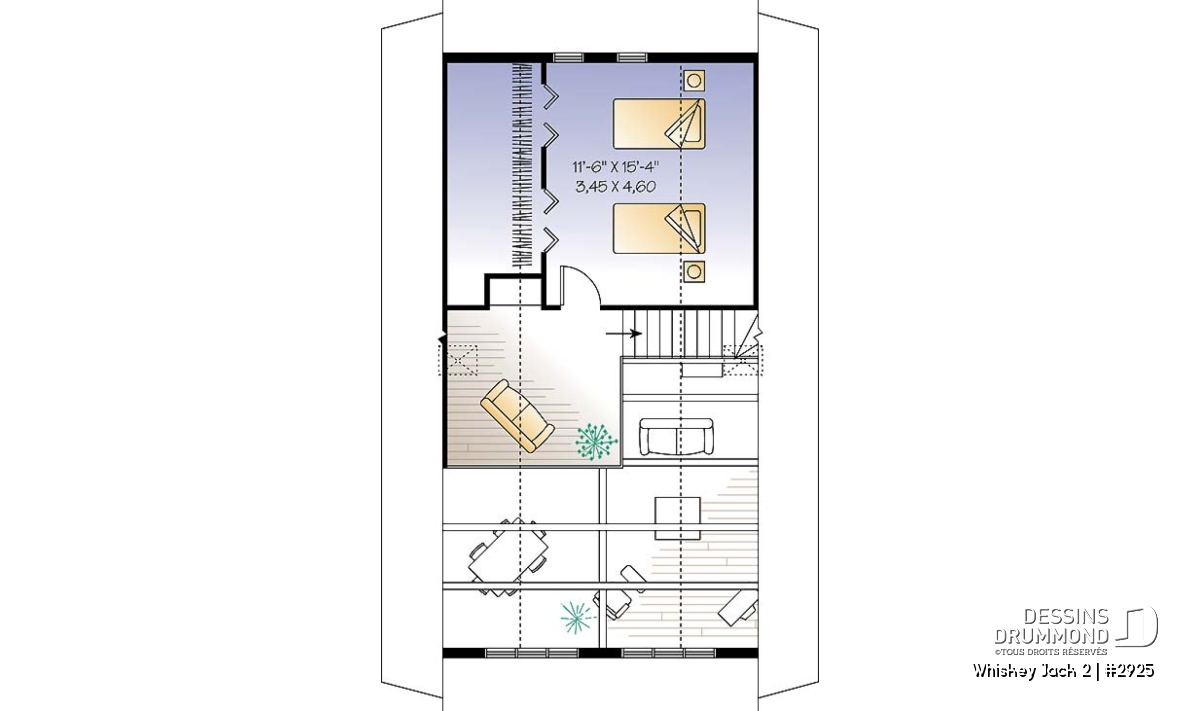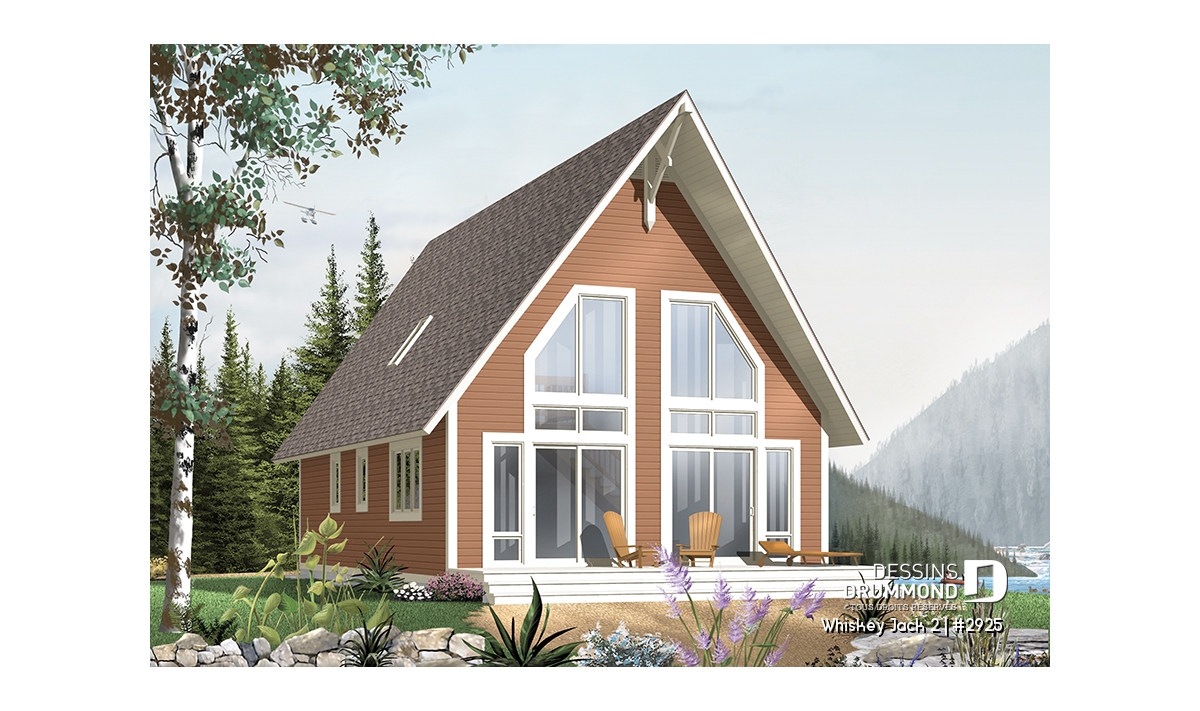 Plan de chalet abordable 2 chambres + loft, mezzanine, vestiaire, plafond cathédral, belle lumière