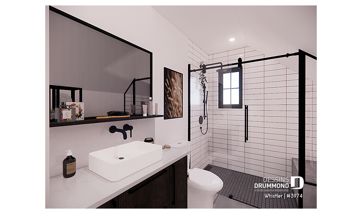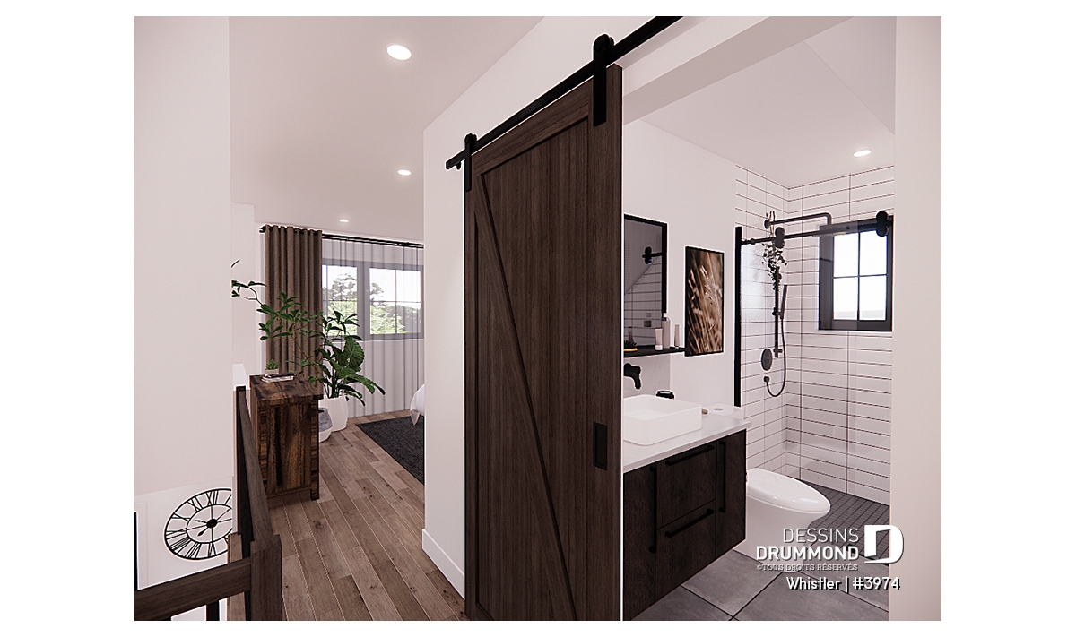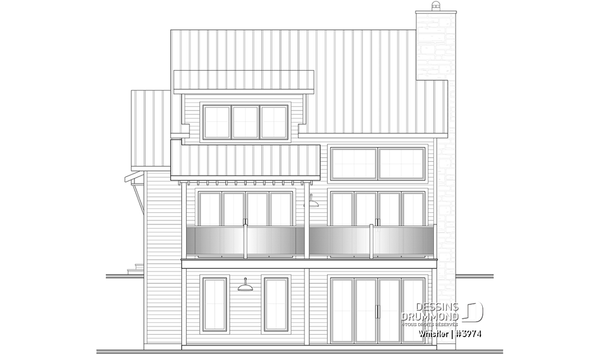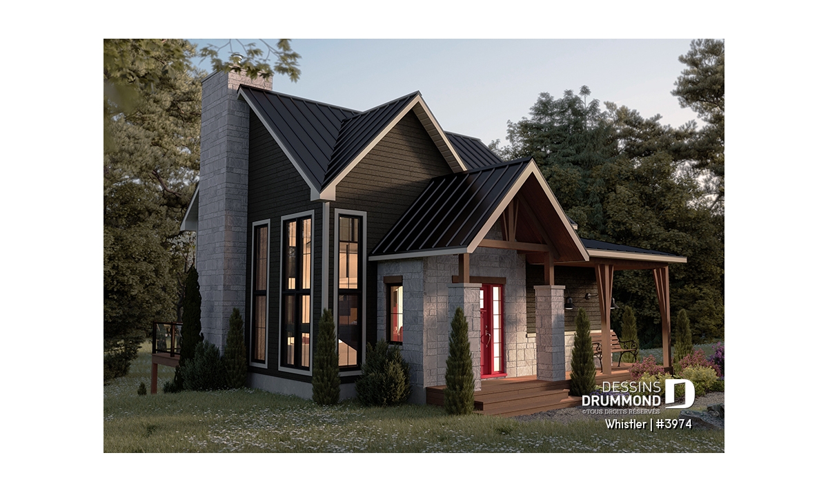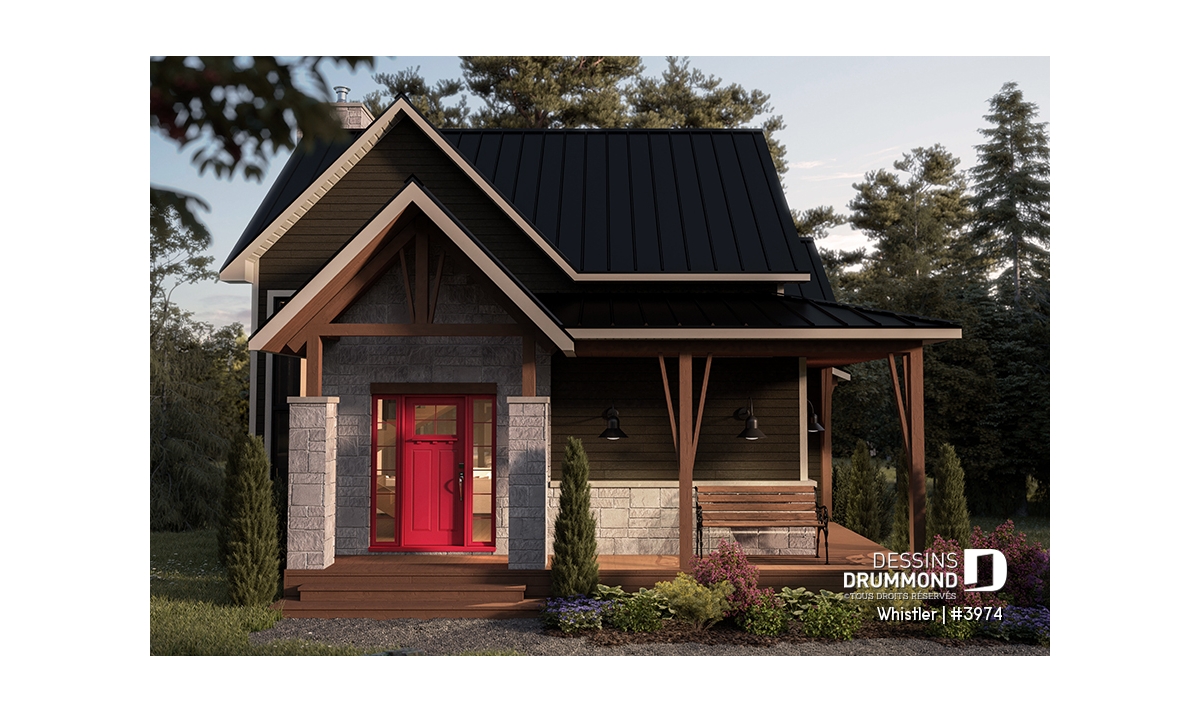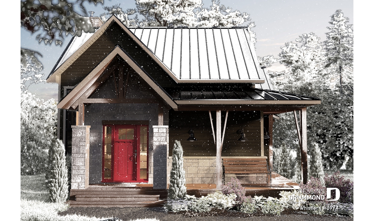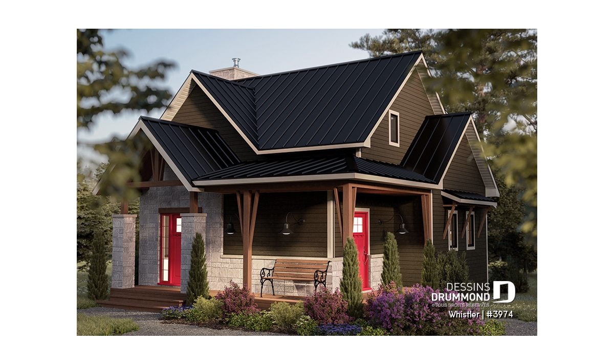 Le plan de maison WHISTLER (#3974) est remarquable pour son look petite maison rustique et chalet de ski à la fois. Aménagé sur 3 étages, avec fondation en rez-de-jardin, il offre cependant tous les espaces requis pour une famille de 4 personnes!