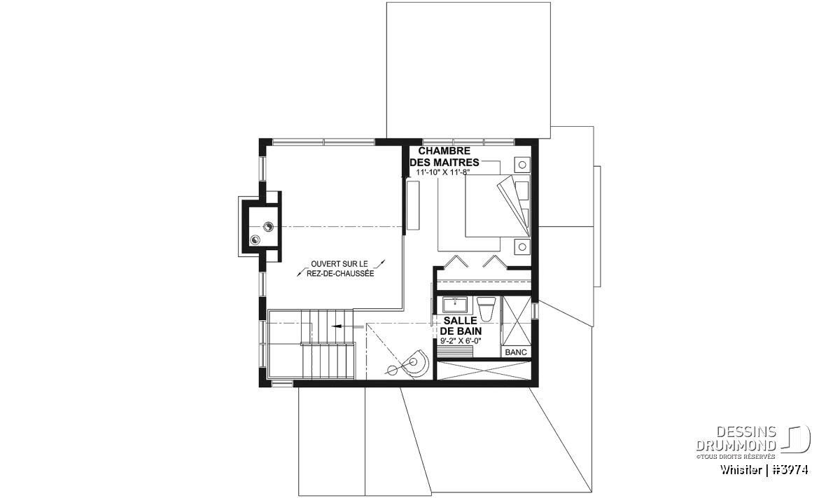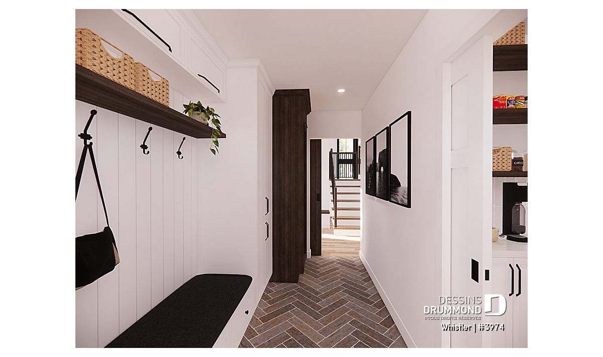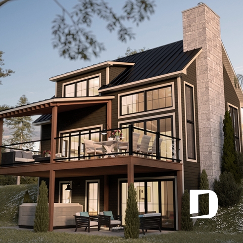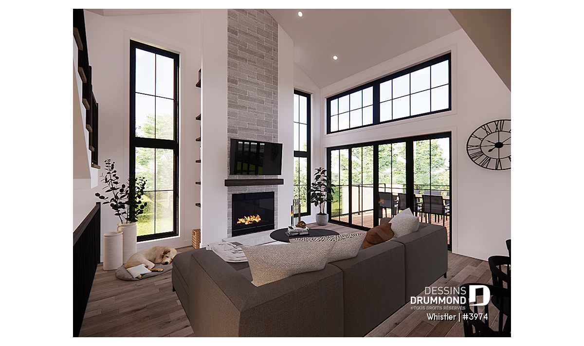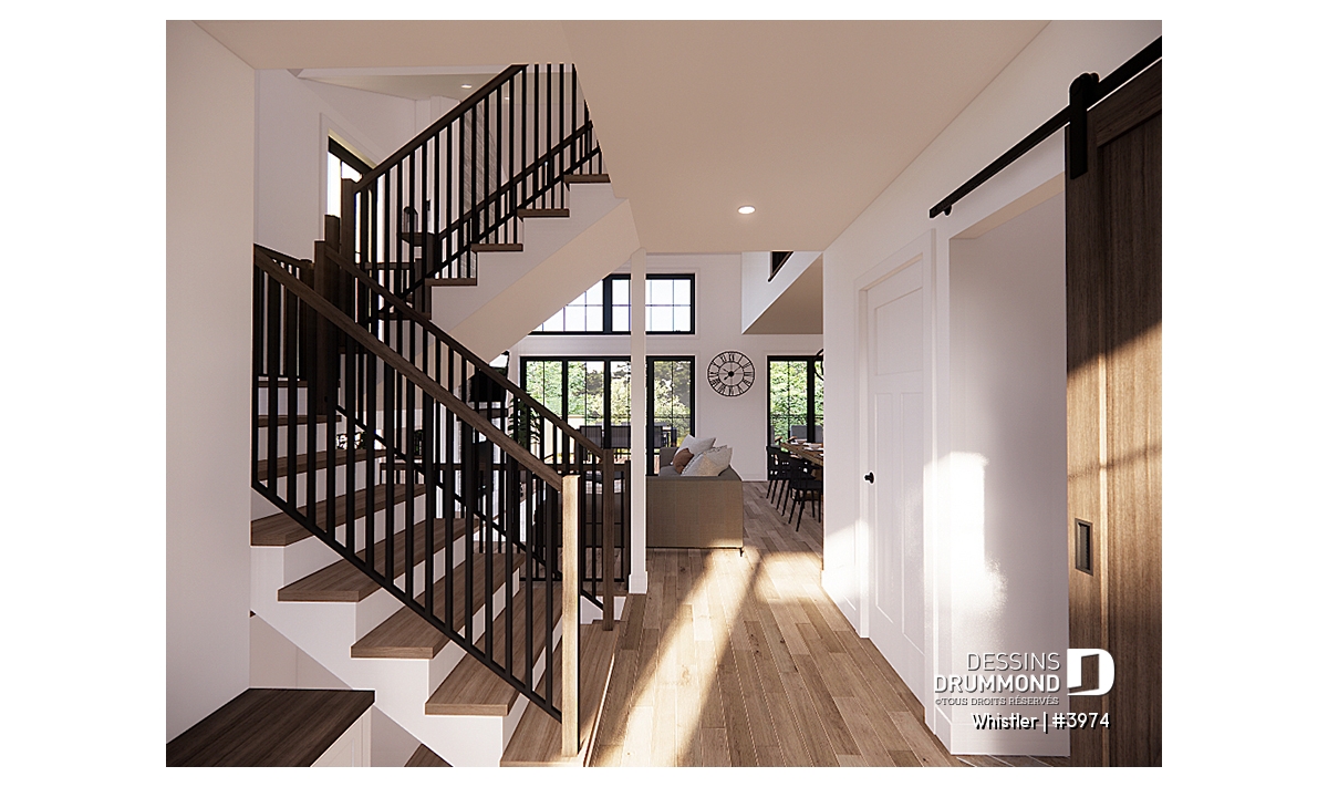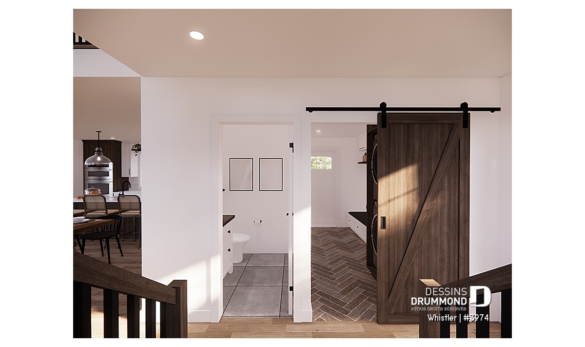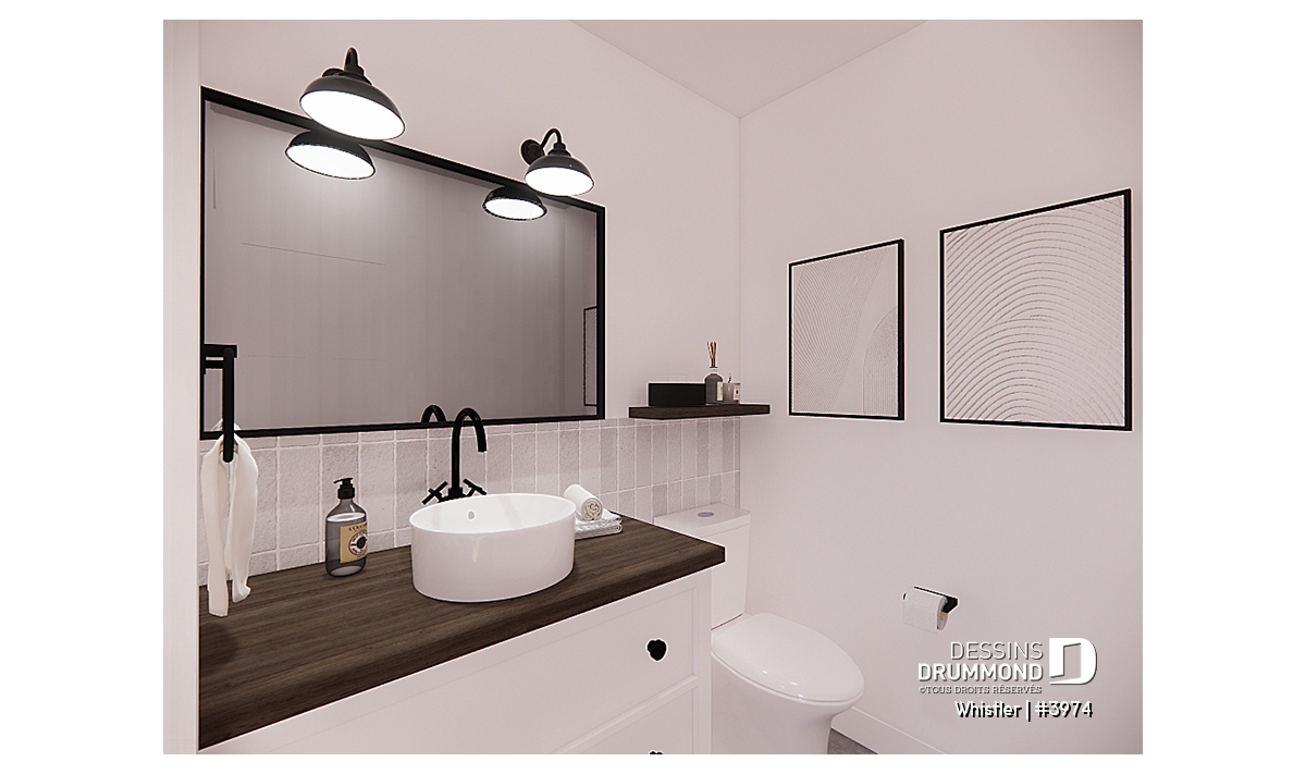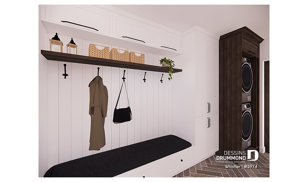 Le plan de maison WHISTLER (#3974) est remarquable pour son look petite maison rustique et chalet de ski à la fois. Aménagé sur 3 étages, avec fondation en rez-de-jardin, il offre cependant tous les espaces requis pour une famille de 4 personnes!