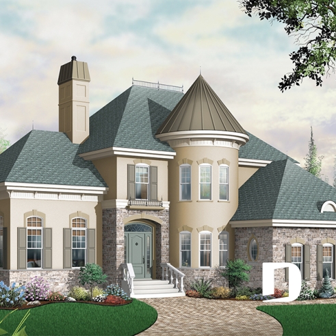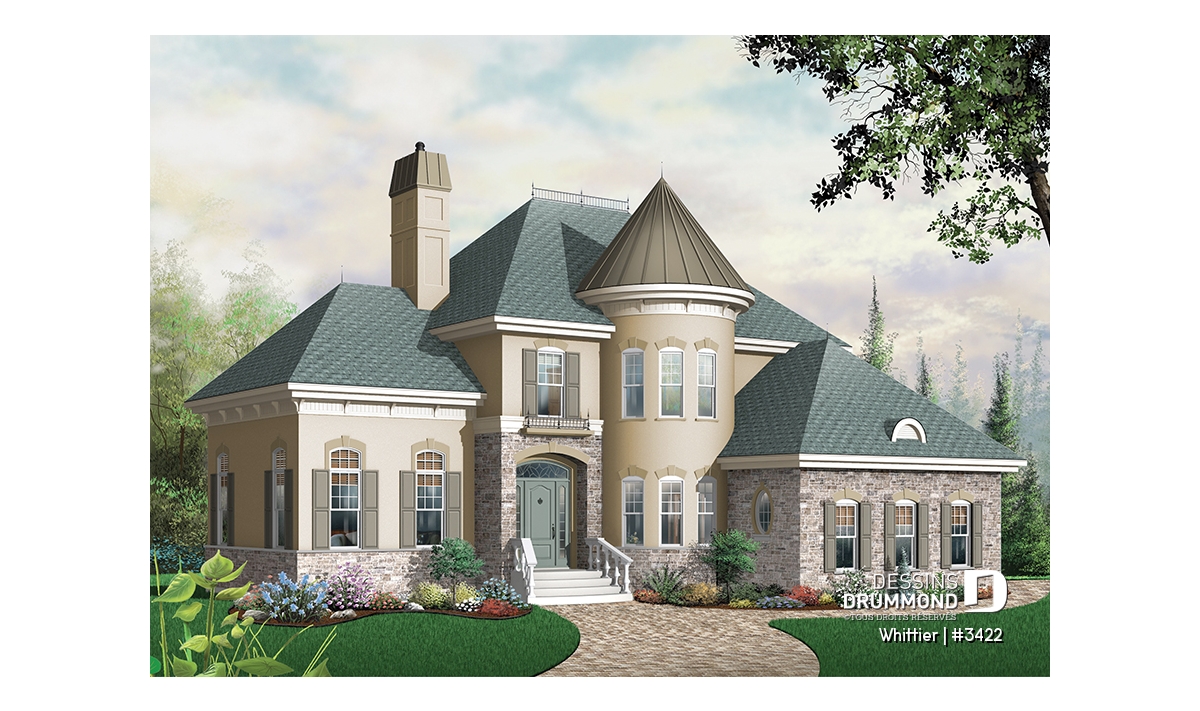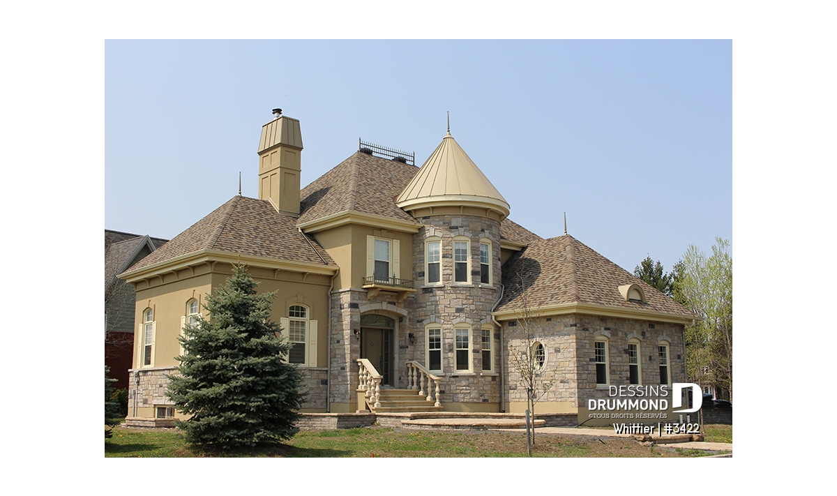 Plafond à 9 pi. au rez-de-chaussée, plafond à 12pi à la salle familiale, bureau à domicile dans la tourelle, foyer monumental ouvert sur deux côtés tout comme l'escalier à sa base.