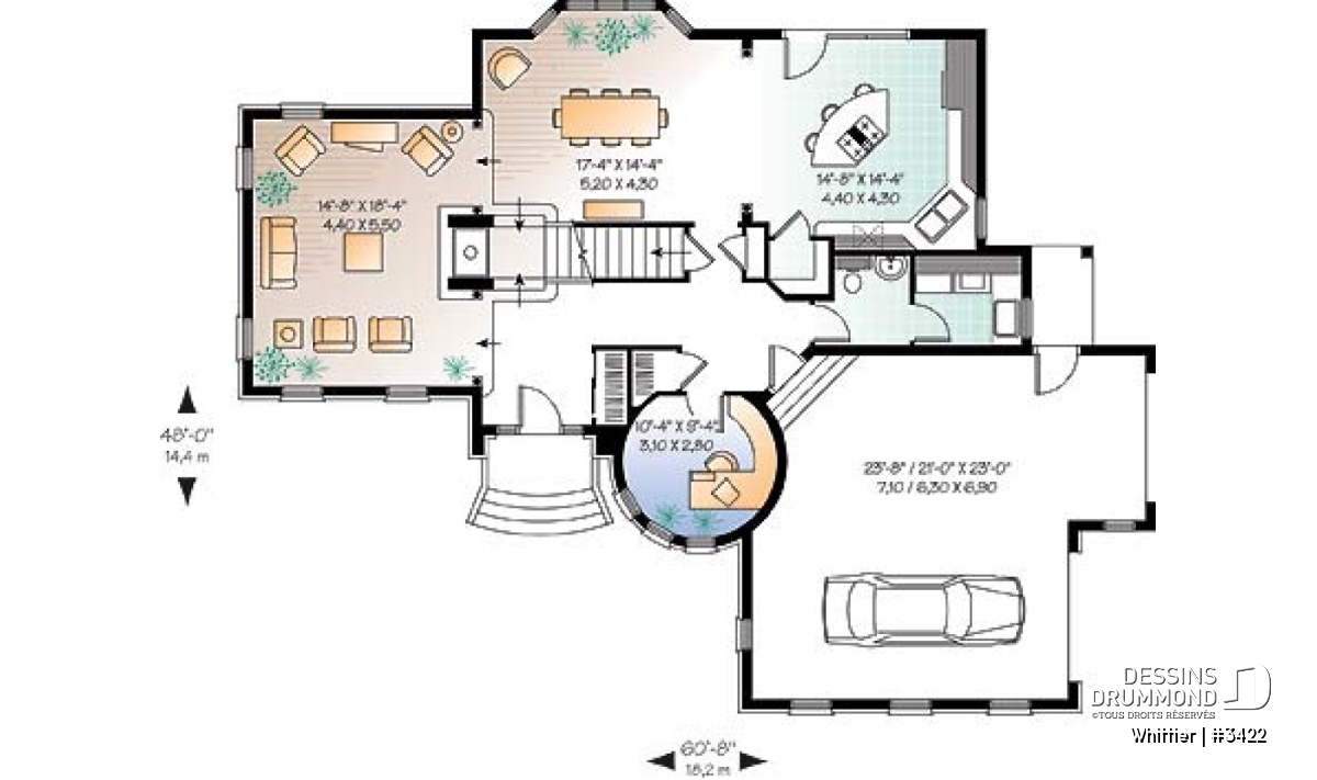 À l’intérieur, on est d’abord accueilli dans un espace entrée original car ouvert partiellement sur une salle de séjour pittoresque, au plafond à douze pieds, partageant un foyer mitoyen avec un palier d’escalier assurant l’accès tant à cette entrée qu’à la salle à manger. Cette dernière, à l’arrière, se veut des plus confortables et bien éclairée avec une large fenêtre en baie. On remarque aussi, sur l’arrière, une cuisine attrayante avec un assez grand garde-manger, un îlot lunch central et une triple porte jardin. Attenant à celle-ci, on retrouve un coin toilette ainsi qu’une buanderie. La tourelle suggère pour sa part un espace bureau aussi original.